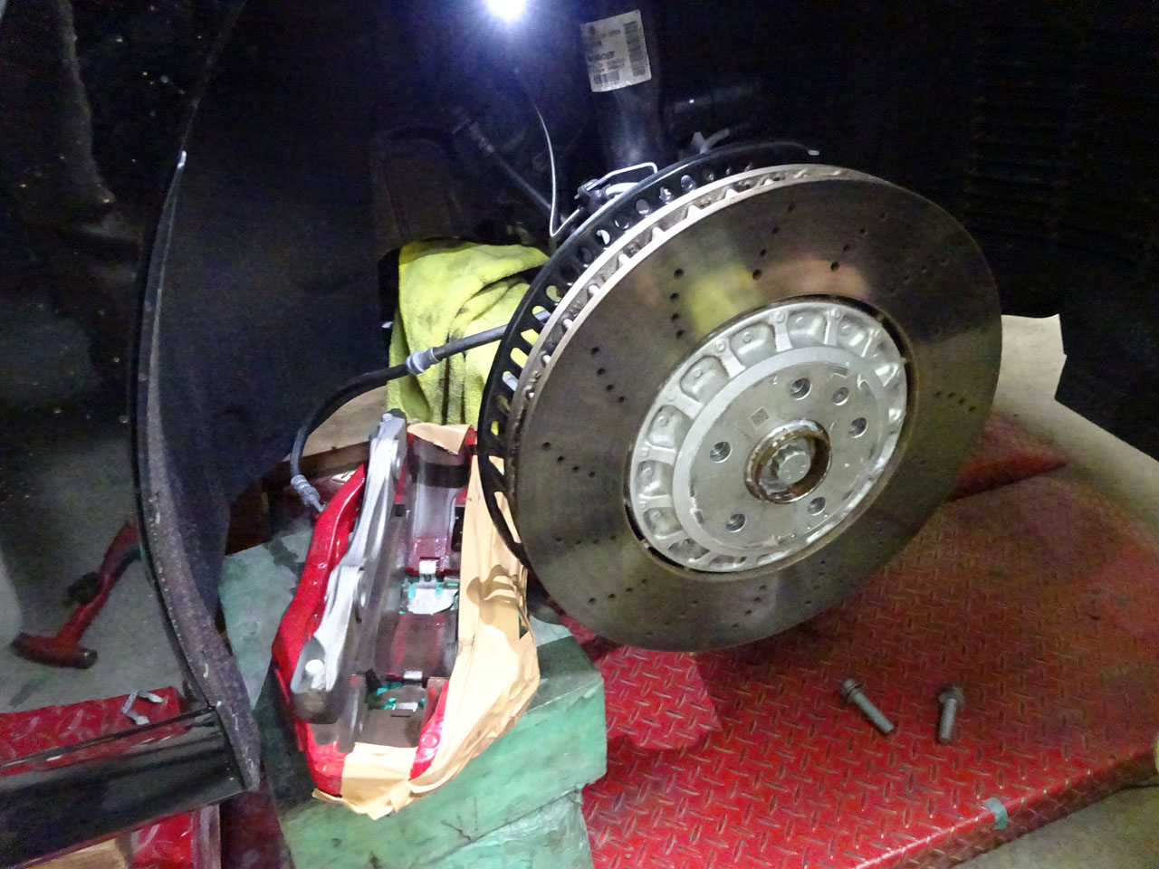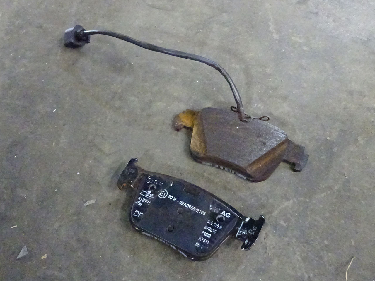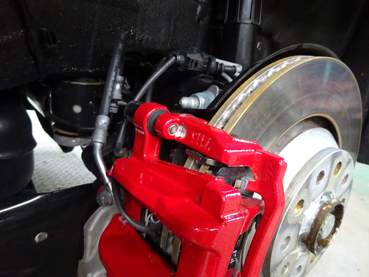 ご用命はというとATE RS 3(GY/8Y)用低ダストセラミックブレーキパッドセットへの交換です。フロントはモノブロックなので重くて大きくて作業性がいまひとつ、ちょっと交換が大変です。リアはキャリアから外すだけなので比較的楽といえば楽、もちろんエレクトリックパーキングブレーキなため注意して作業します。ようやく最近リアパッドにも残量センサー付きが発売され、失う機能はありませんご安心ください。お客様はあちこち問い合わせたそうですが、どこもリア用がないと断られ、ようやくG-Speedを発見しご来店となりました。無事終了です。