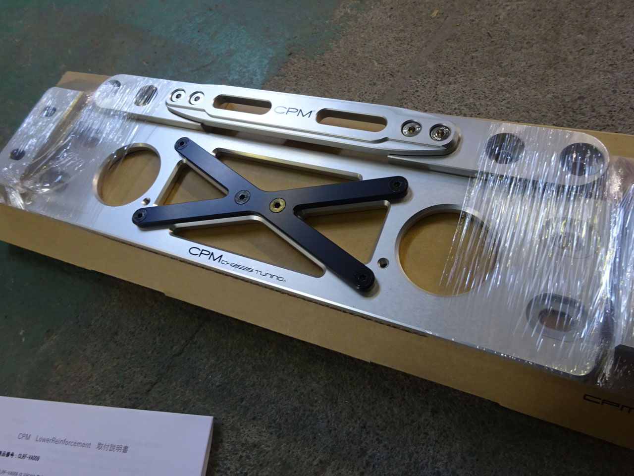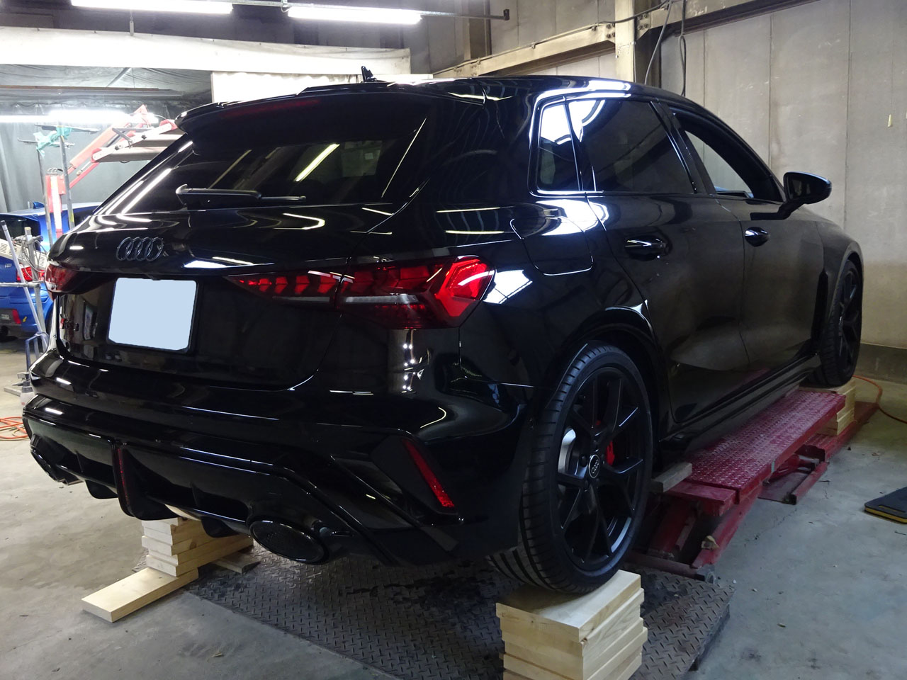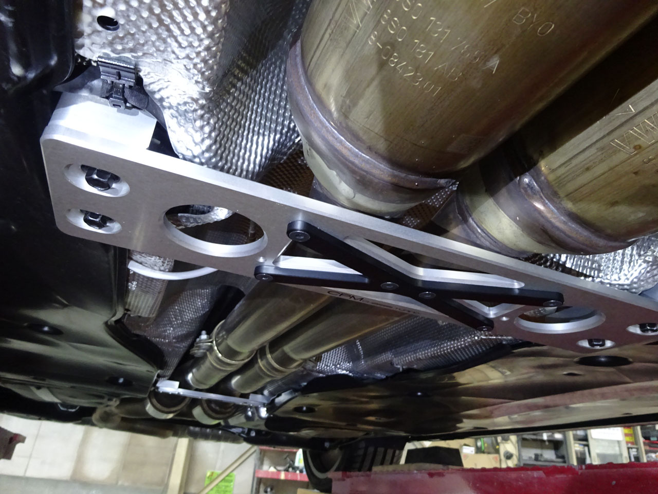 何と同日にMY25FL後RS 3SB2台目、ボディカラーも同じブラック、パノラマルーフ付きやホイールまで同じ!でもちろん別のお客様が来店ですありがとうございます。ご用命はというとご覧のとおりCPMアウディ各車種用ロアリインフォースメントの取り付け、交換です。リアはスチールパイプが標準でも付いていますので交換、フロントは標準でも付いていますが、マフラーの上を通しているので・・・それをマフラーの下に追加してあげます。着地状態1Gでの取り付けかつ締め付けトルクも厳密に決められているのでトルクレンチできっちり締めます。結果シャキッとして直進性が上がったという方もいれば、コーナーで回頭性が上がったという方もいらっしゃいます。さすがはCPM、何度も何度もセッティングをし直しただけあり、固すぎない補強の言葉がピッタリです。