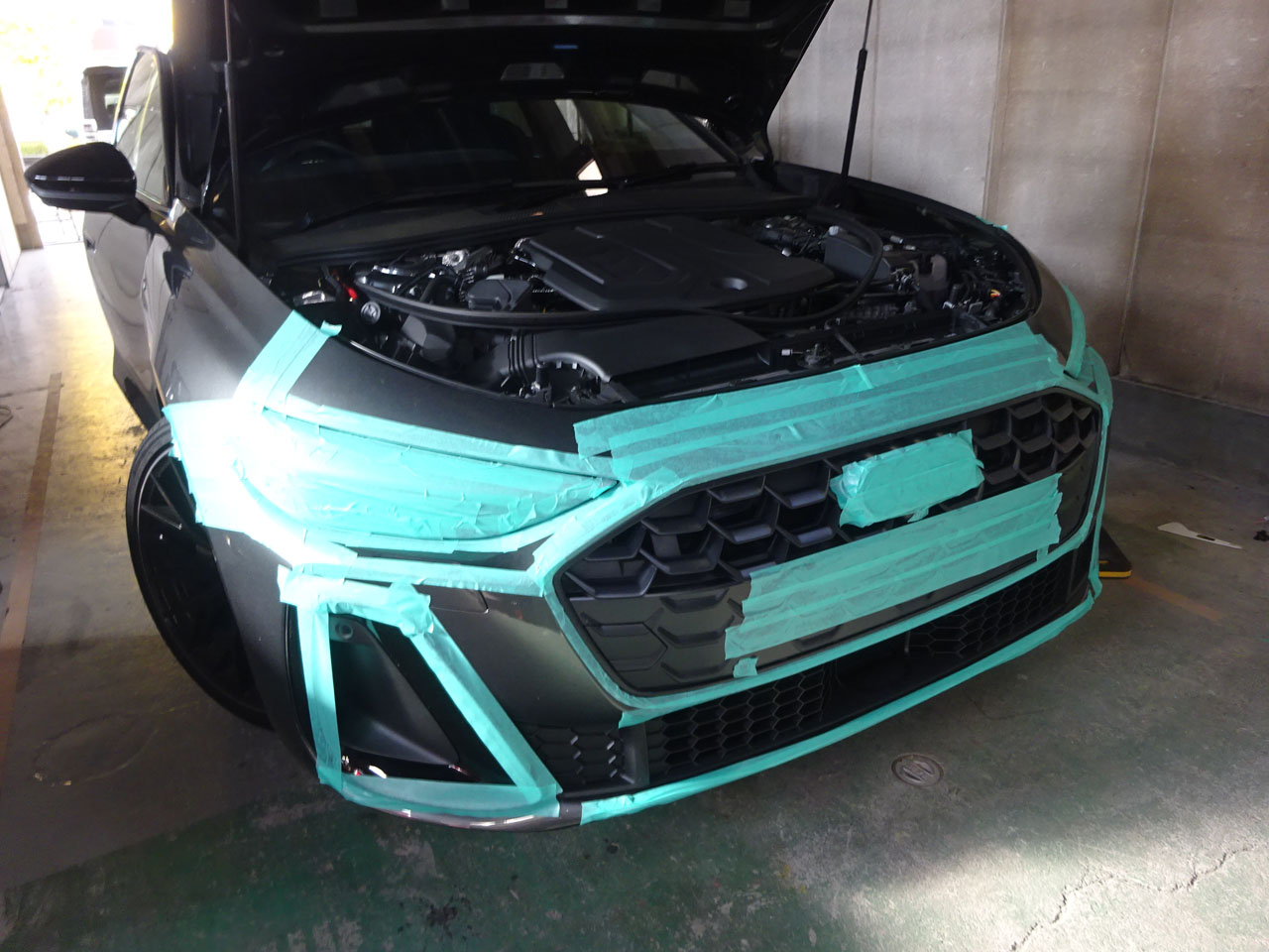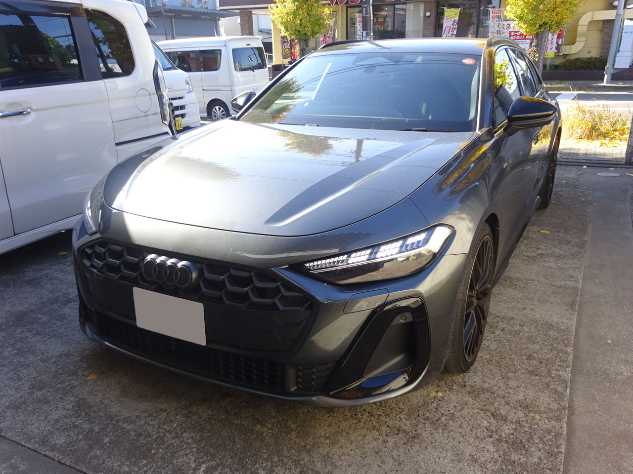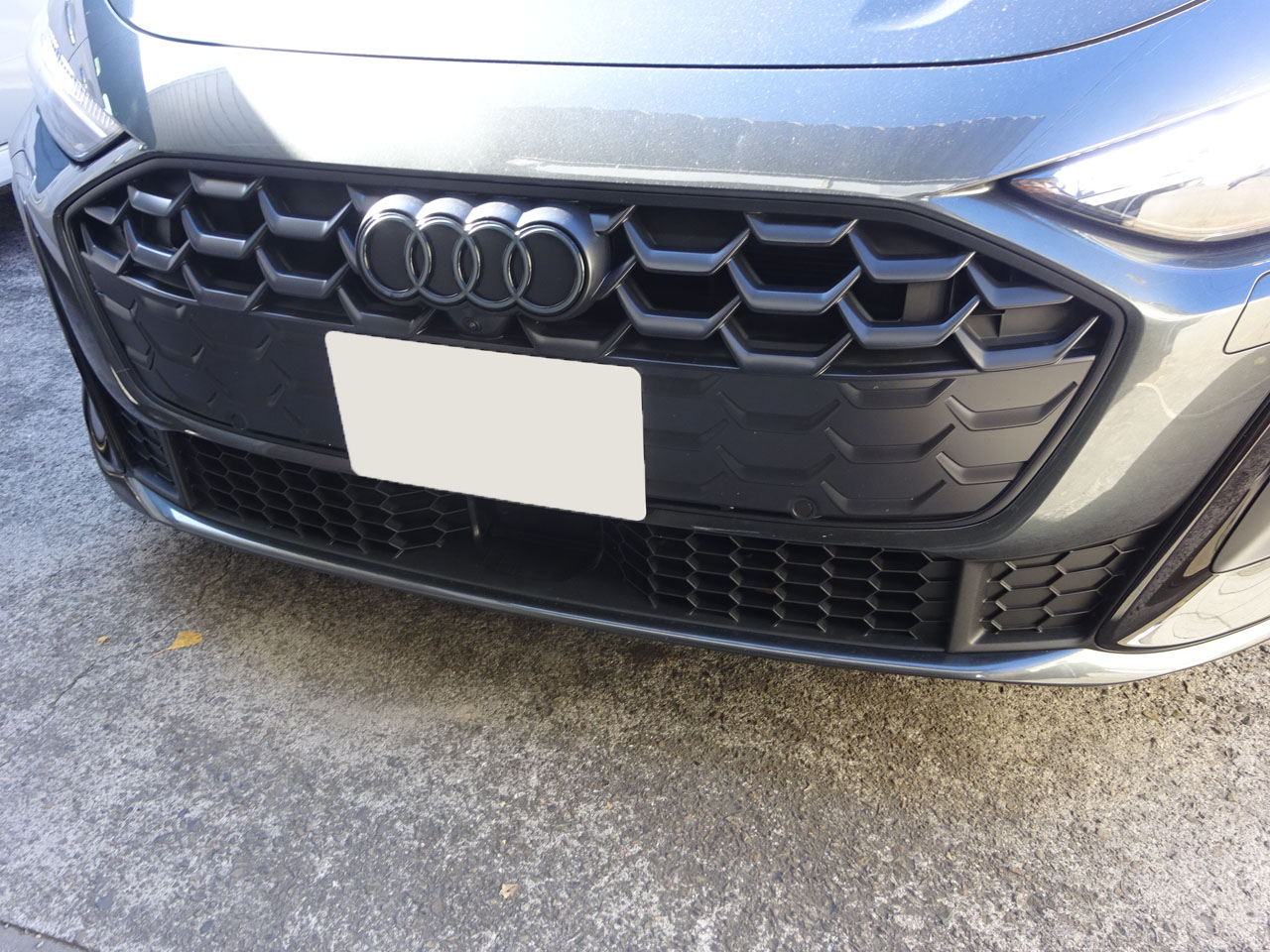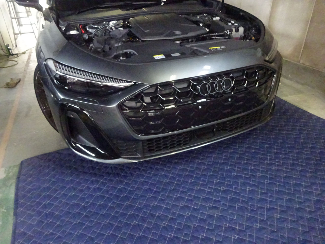 A5(FU)アバント・ガソリン150KWクワトロS lineでお客様が来店です。ありがとうございます。実はこちらのお客様、先代A4アバントを購入された際もすぐいらしてフォーリングスやA4ロゴエンブレムをブラックスタイリングに合わせてブラックに交換でしたが、今回も納車後すぐのご来店、どんなメニューでしょうか!あれもうホイール/タイヤが変わってる!納車時は19インチでしたが社外20インチMSWに、なかなか似合ってます!ブラックスタイリングパッケージではありますが、何と・・・グリルがツヤ消しブラックなのです。私もG-Speed号edition oneがツヤありだったのでてっきり・・・ディーラーさんで初めて見た時は衝撃でした。そういうAudiAGの意向なのでしょうね・・・お客様がG-Speedサイトを見て「本当にそう?」と営業さんに確認したところ「はい、そうです」すぐ交換を決断、納車時にも宣言したとか(笑)「だってどこで交換するんですか?」「いいところあるのよ」そんな会話だったそうです。そんなこんなでアウディ純正A5(FU)用グロスブラックラジエーターグリルに交換していきます。
