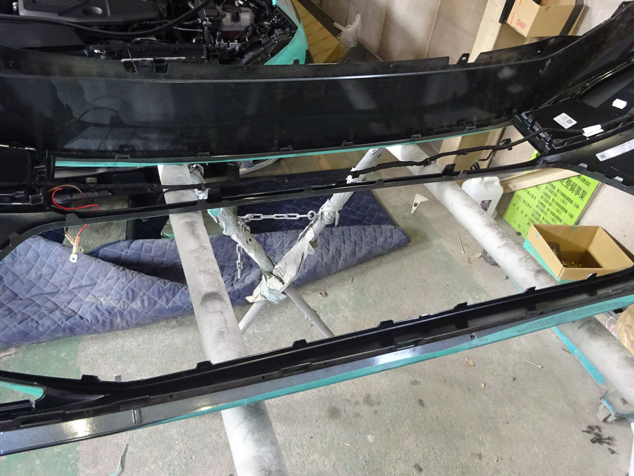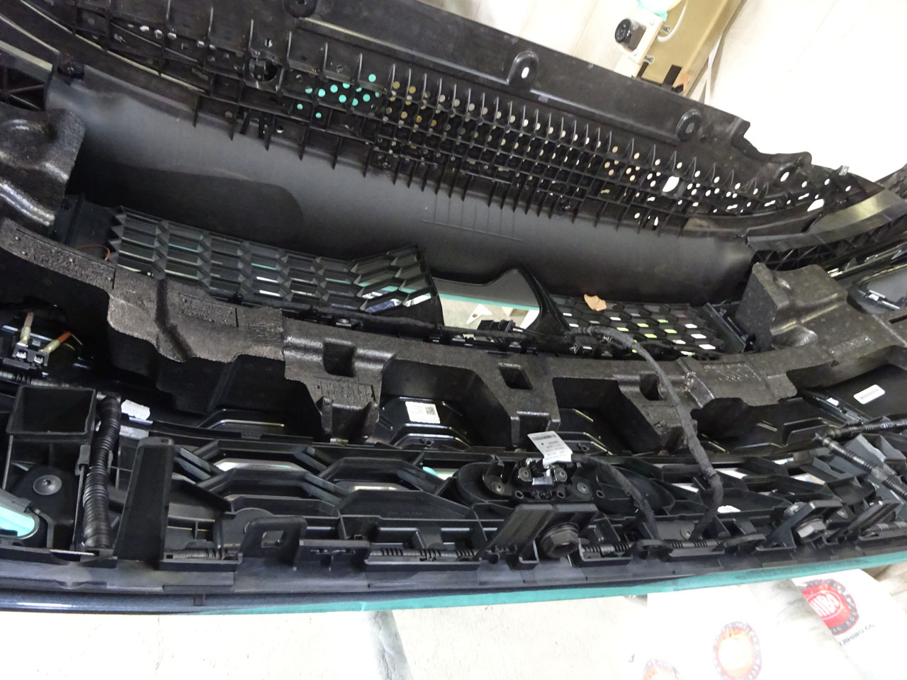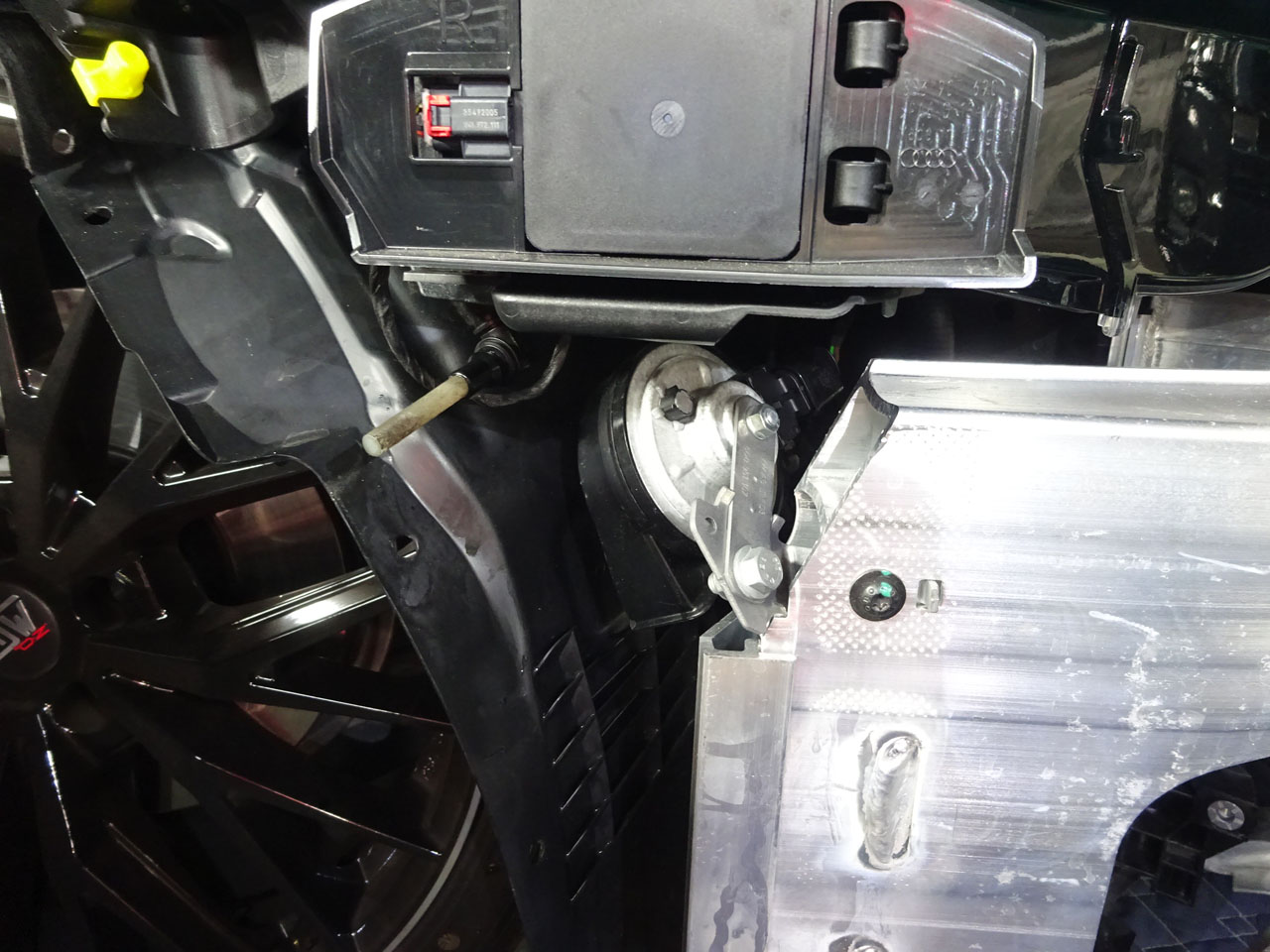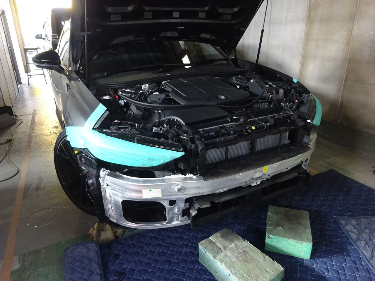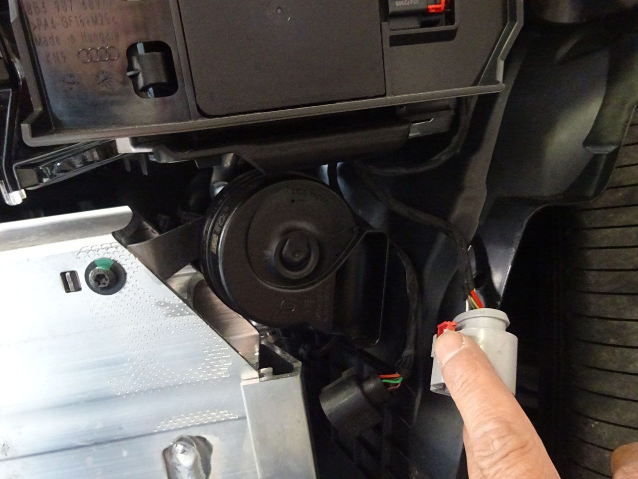マスキングしてウルトラマンにするまでがむしろ大変、それが終わったらもう早いですよあっという間にバンパーが外れました。外してびっくり、何とホーンが最初からツインじゃないですか!お客様の言っていることは本当でした。左右に1個ずつついている・・・ムムム相当言われたな!調べたら3月下旬に製造された車両からツインになっているようです。最初からしとけよ(笑)救いなのがHella製A5/S5(FU)用Twin Tone Hornの方が低音寄りなのか多少いい音がします。
