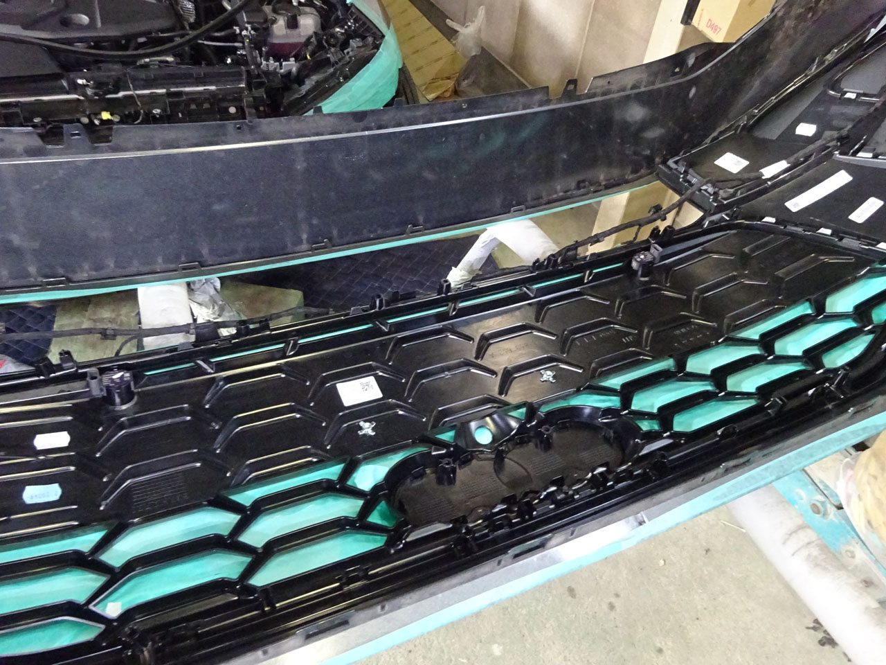 外してからがまた大変、左上写真から右上写真の状態にするまで、いったいいくつのツメをリリースしたことか・・・ヤマ場を越え組むのはもうパチンパチンツメを入れていきボルト止めするだけですから比較的楽と言えます。新しいグリルをはめ込み元通りにすると、はい、ツヤッツヤグリルへの交換が終了しました。当然ながら加工は必要ありませんピッタリフィットです!