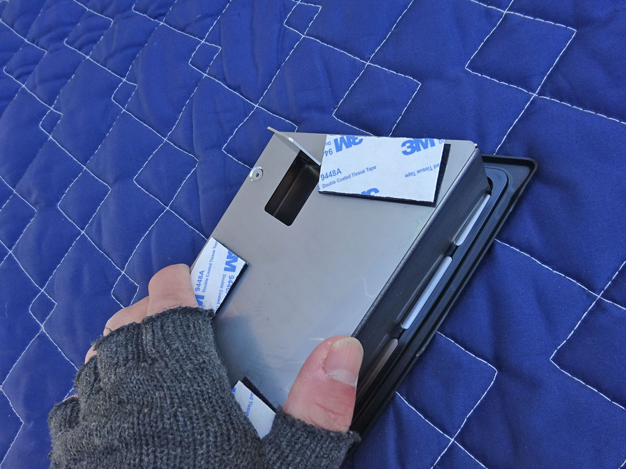 まだマジックテープの剥離紙が付いた状態、このままで仮合わせをします。アダプターの出っ張った部分ブラケット2ヶ所はフロアカーペットに開いた穴のいちばん下といちばん上の穴に入ります。まずは下の穴から、ちょっと左に傾けながらやるとブラケットが見えやすくていいかもしれません。上のブラケットも入ったら、右側の接地点と写真にはありませんが下の接地点(私は慣れているので下のマークをしていないだけです)をテープ等でマークします。1度外し、今度は本付け、剥離紙を剥がし、慎重にマーキングに従い再度ブラケットを穴に入れます・・・ゆっくりですよ!何とか入りましたね!マジックテープの両面テープをフロアカーペットに密着させるためぎゅーっと全体をよーく押してください。1ヶ所最低1分を目安にしてください。