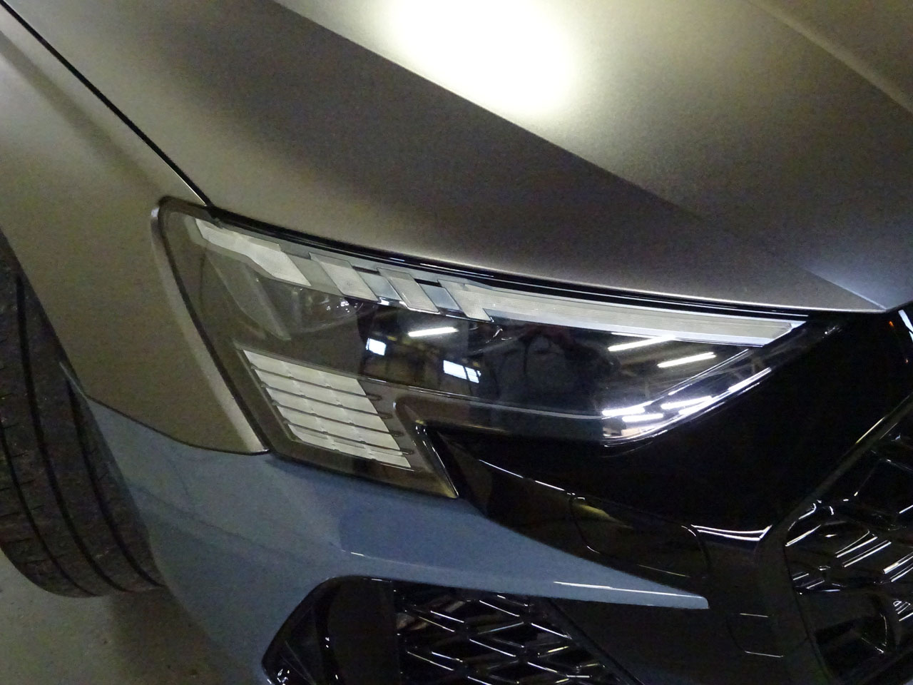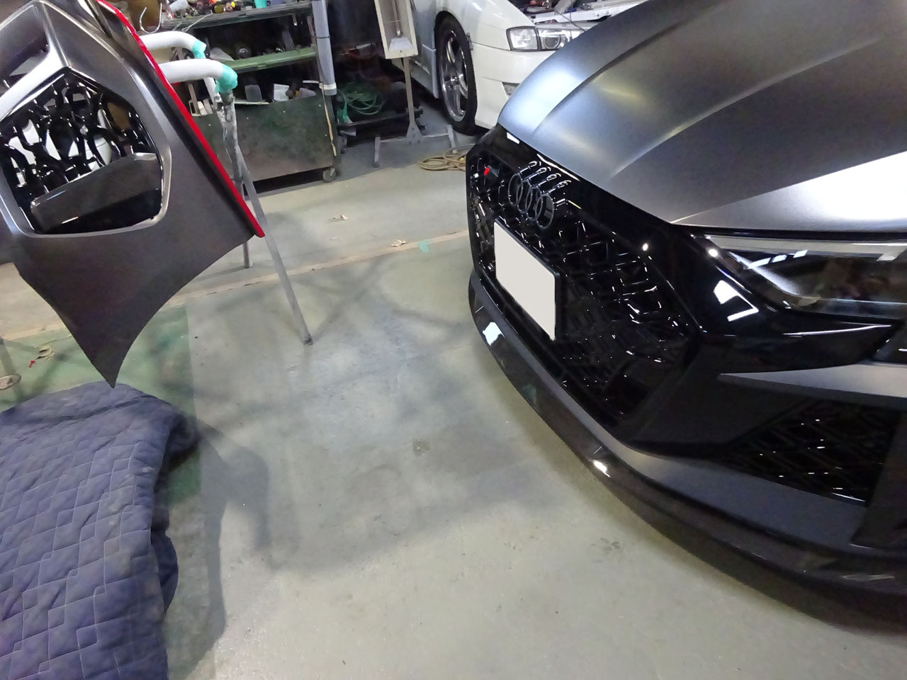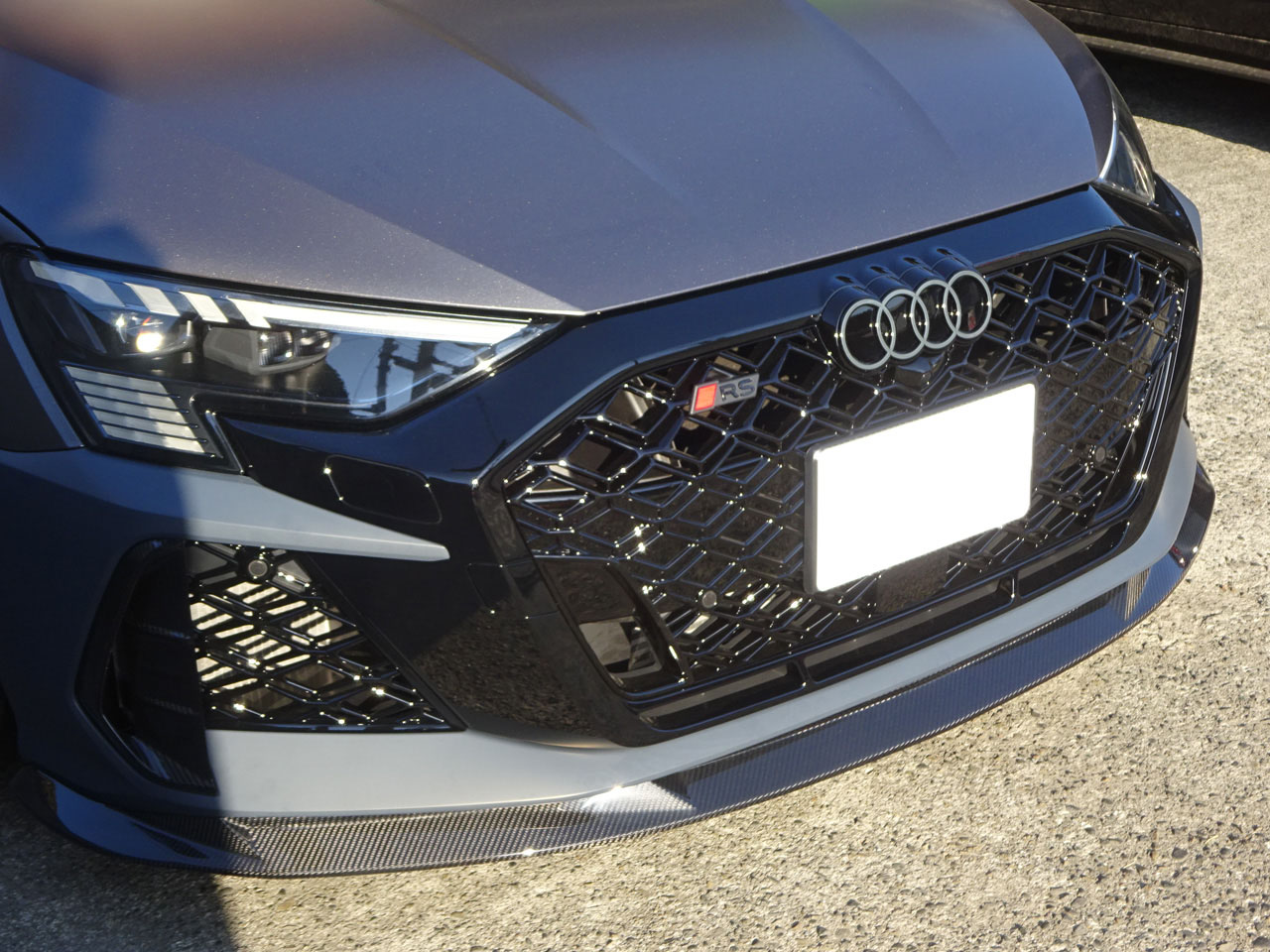 大変な部分もありましたが完成!目論見どおり加工は不要、交換のみでOK、失う機能はありません。お客様に「2度目の納車みたい!」とものすごく喜んでいただけました。私はこの移植は国内外まだ見たことがないので、もしかして世界初?じゃないでしょうか!ちなみにバンパーが下地のままなのはラッピングをするからですのでご安心ください。なぜか違和感ないですが(笑)カーボンのリップスポイラーとエアガイドグリルは社外品で付属しません~新しいRSロゴグリルエンブレムも別売りとなります。ナンバーを固定するライセンスプレートブラケットは、純正だとひとまわり小さい北米共用の小さいので、全体をカバーする純正流用になっています。