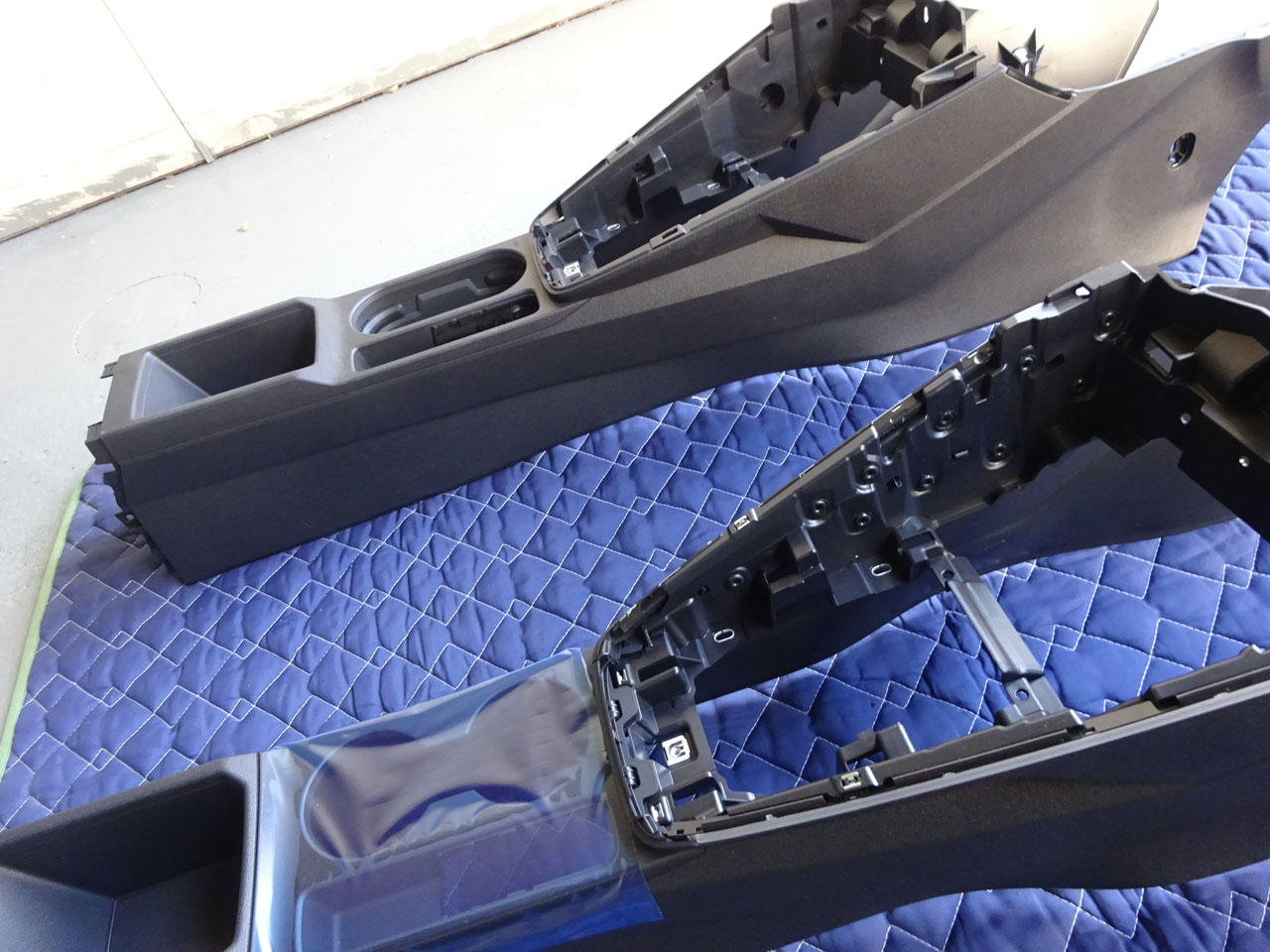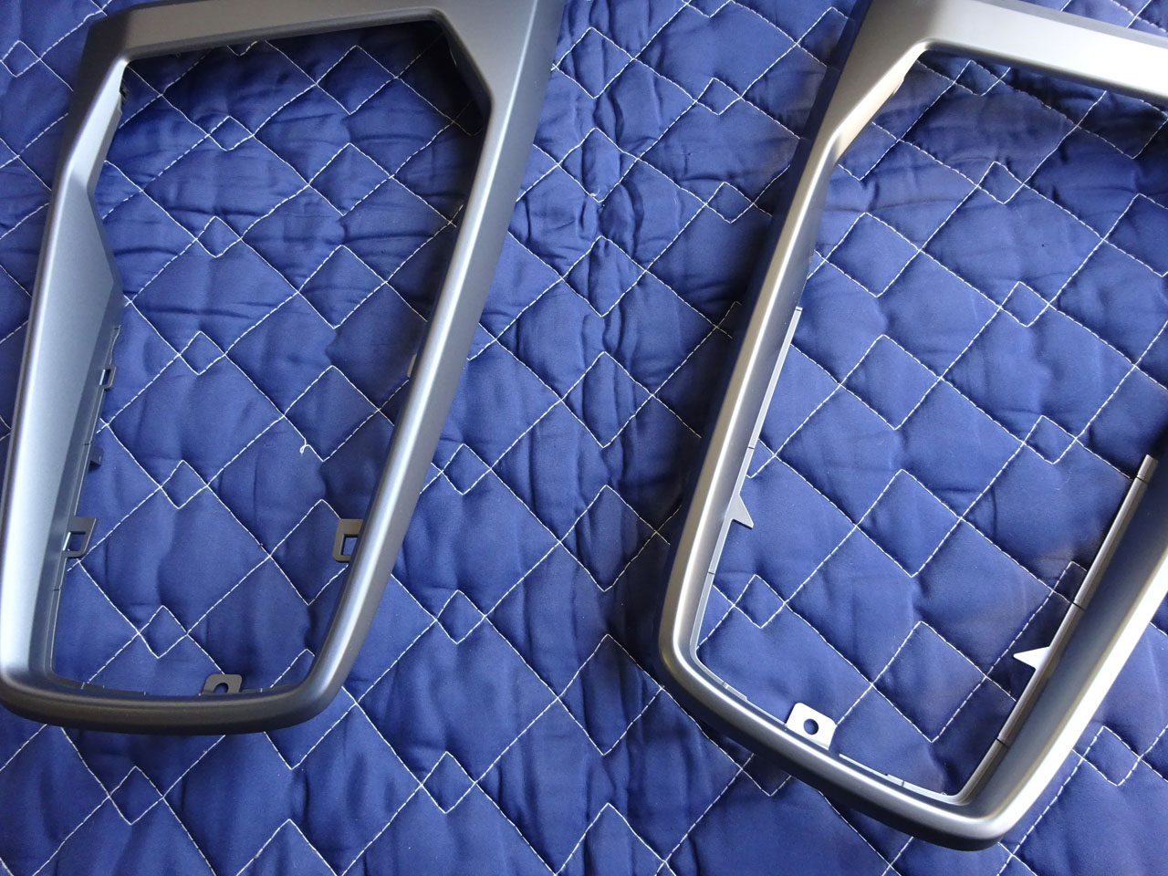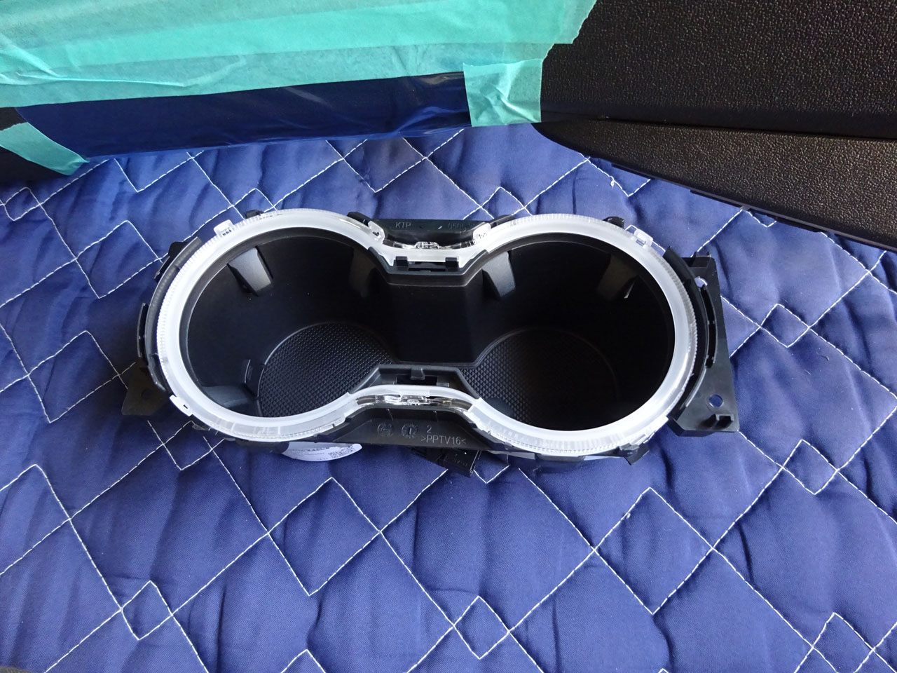 時間の都合上ずいぶん省略してしまいましたが・・・センターコンソールがA3系は本当にまるごとごっそり外れるので、車外に出すのが結構大変だったりします。新旧揃い踏み、コンソールトリムとセンターコンソールの間、左右の白く見える部分がイルミになってます。ちなみに分解するには結構な手順を踏まないとエラーだらけになるので注意しながら作業することも必要です。もう私は慣れたものですので自然とその手順を踏んでいます(笑)コンソールパネルも微妙にというかそこそこ違うので同時交換が必須、今回はカーボンファブリックに合わせてグレーを選択されました。長円からひょうたん型になって飲み物が飛ばないドリンクホルダーにもイルミが仕込まれています!これが大事。