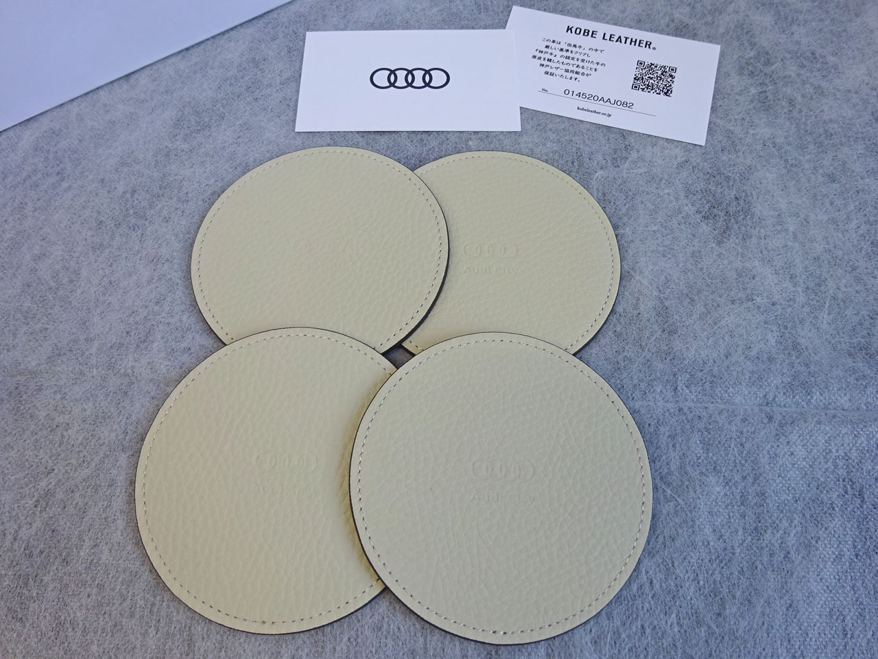 知りませんでした今はAudi City専用グッズなるものもあるんですね!KOBE LEATHER?初めて聞きましたが皆様ご存じですか?有名なんでしょうか?いろんなのがあるのですが、皆きれいな仕上げでした。思わずコースター4枚セットを購入してしまいました。Audi Cityロゴが入っていてこげ茶色の丁寧なコバ仕上げ、さすがは日本のワザです。