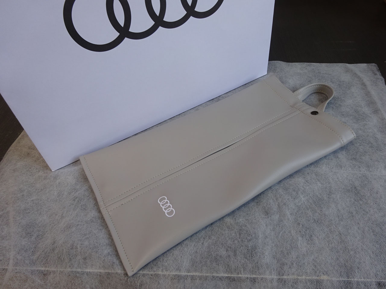 レザーではありませんがA5 edition oneに合いそうなシルバーのティッシュケースがあったのでこちらも購入しました。取っ手の長さが調節できるのでシートのヘッドレスト等にも固定できそう、使ってみます。このケースこそレザーがあったらいいですよね!