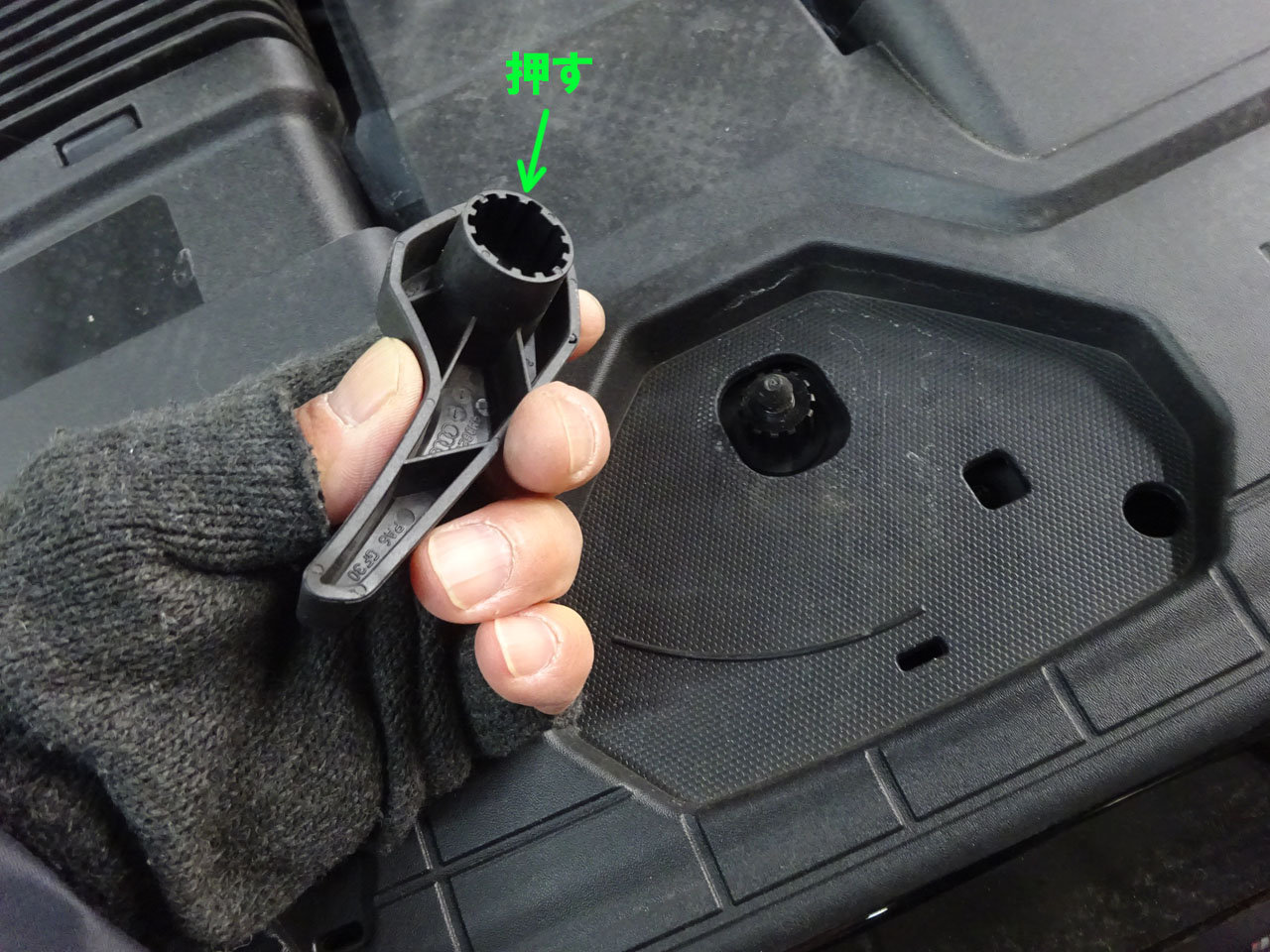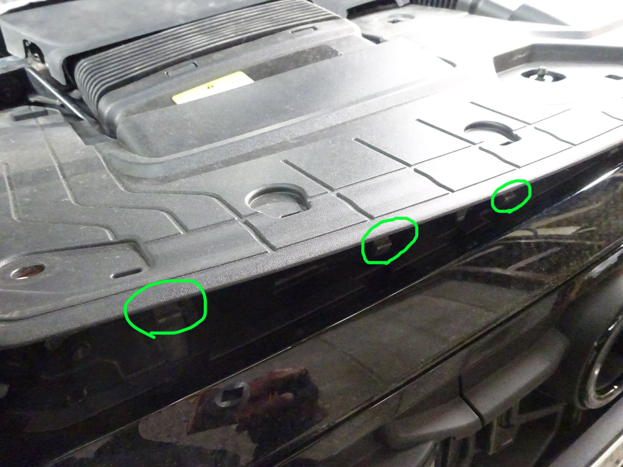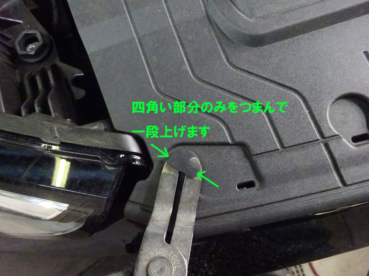 車を平らな場所へ停めパーキングブレーキを引きます。必要な工具は小さいマイナスドライバー、内張りはがし、クリップリムーバー、ライト、小さめなトルクスT25レンチ、養生テープでしょうか。ボンネット開けグリル上のカバーを外していきます。もちろん初めての方は四方を十分に養生してください!フードオープニングレバーは矢印の四角いところを爪で押して上げれば外れます。次に丸いクリップを5ヶ所外します。丸いクリップですがその中の四角い部分だけを工具(小さいマイナスドライバーで代用可)でつまみ一段止まるところまで引き上げます。止まったらクリップ毎工具を上げれば、外れます。同様に他の4か所も外します。