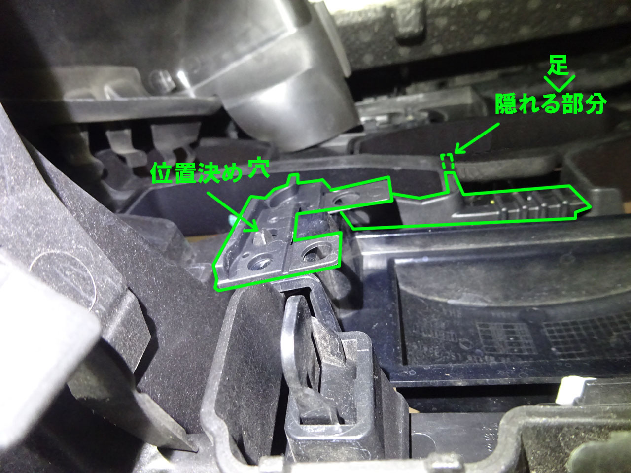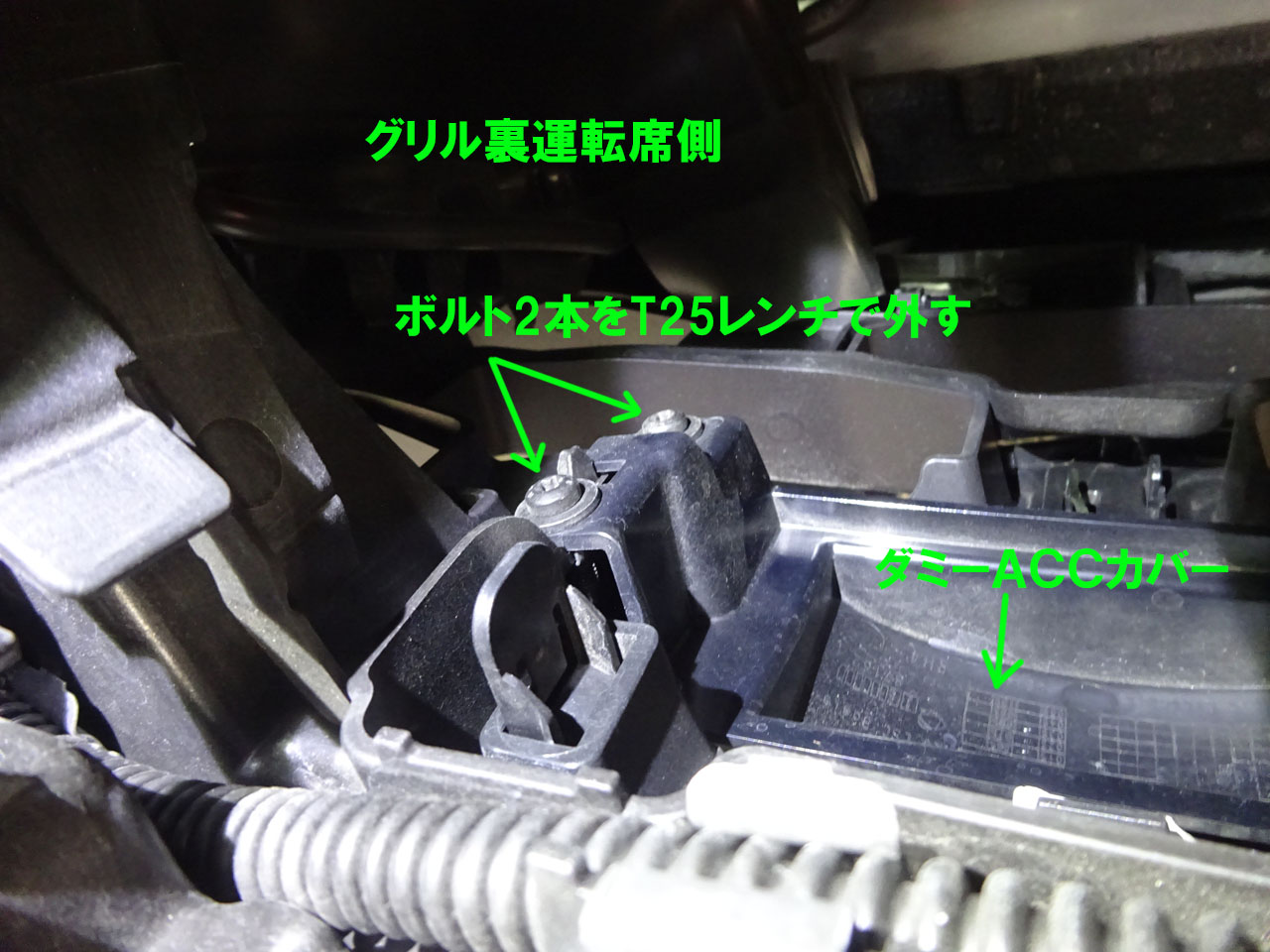 グリルの裏です。右側のACCに見える部分、実はダミーのカバーのみ、そのためボルトを外してもACCには何ら影響ありませんのでご安心ください。2本のボルトが見えますのでT25レンチで外します。養生したエンブレムを、足部分からグリルとグリルの裏骨とも言えるブラケットのすき間に入れる感じ、それとボルト2本の間にある位置決め穴にさくっと入れるとおのずとはまってくれます。左下写真のグリーンに囲んだ部分がエンブレムです。ちょっと説明のしようがないのですが、この写真を参考に入れてみてください。あっさりとはまります。からさくっと入れていきます。あとはボルト2本をエンブレムとグリルを共締めし、逆手順でグリル上カバーをはめこみます。なぜボルトを締める穴が2個とクリップで挟む部分が余っているのか・・・私はピンときました!ウッシッシ機会があればテストしてみます。