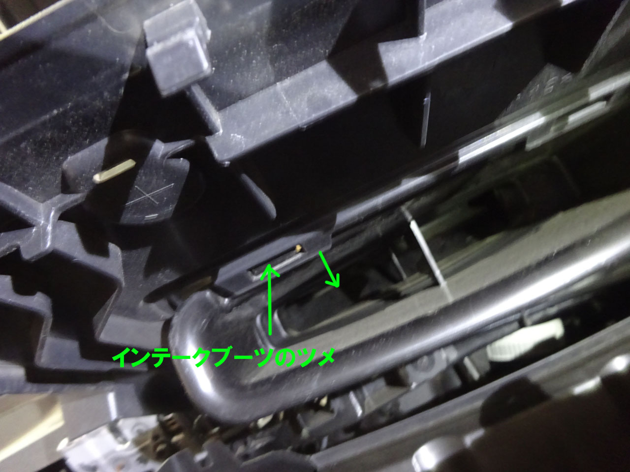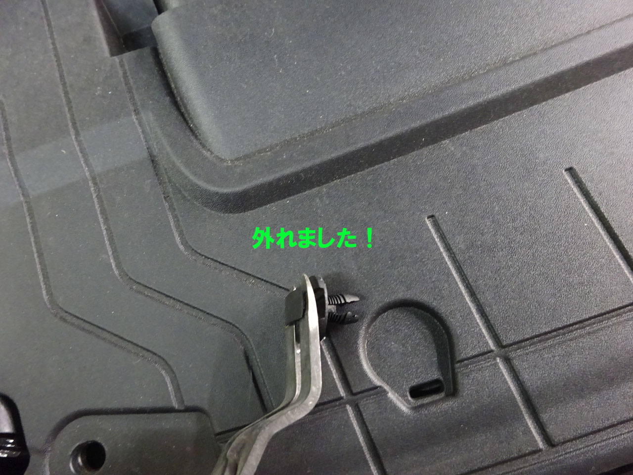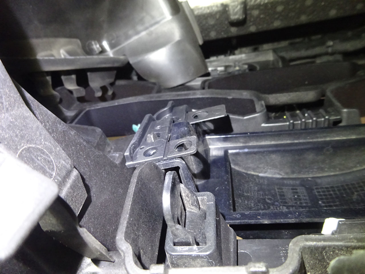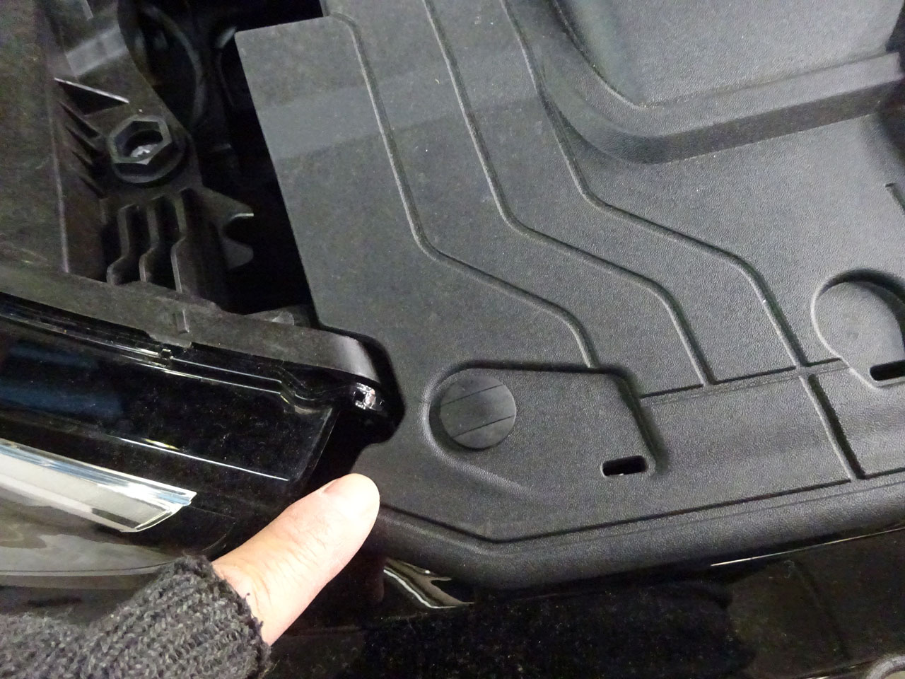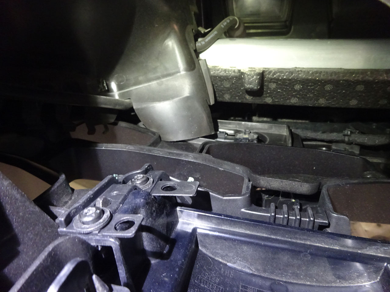 これで終わりではなく、カバー前側が更にツメで止まっていますのでプチプチと10cmくらい上に持ち上げて外していきます。上げすぎ注意!このクラスになると手間をかけてますよね~そのカバーの裏側を見るとインテークブーツがツメで止まっていますので、小さいマイナスドライバーで4か所外します。これでグリル上カバーが外れました。いよいよ次はエンブレムをグリル裏から入れていきますが、思わぬところでキズを付けないよう養生をお忘れなく。にしても変な形状、どうやって付けるのか、イメージが湧きませんね!一番下の足部分からグリルとグリルブラケットの間にいれていきますよ!