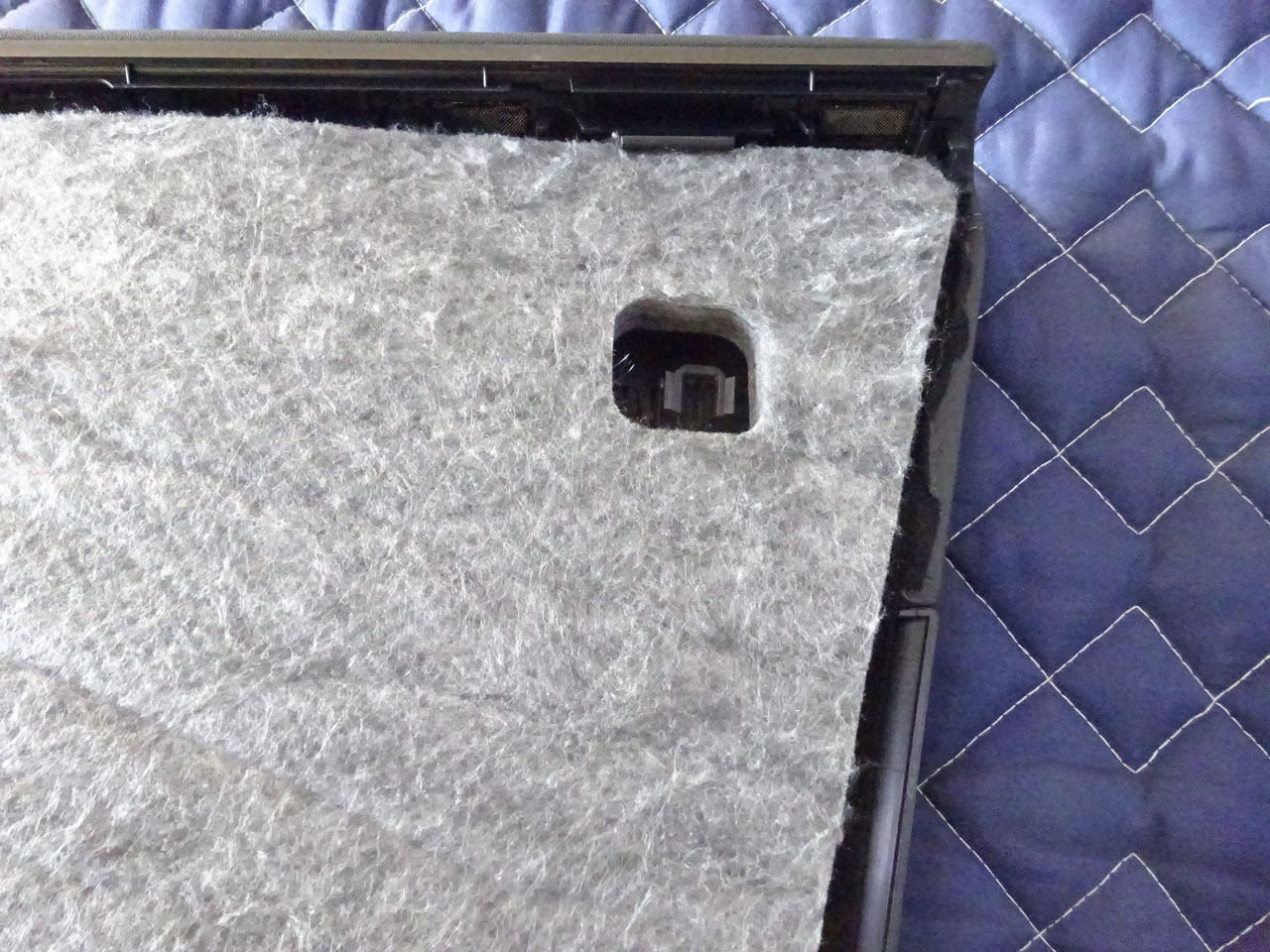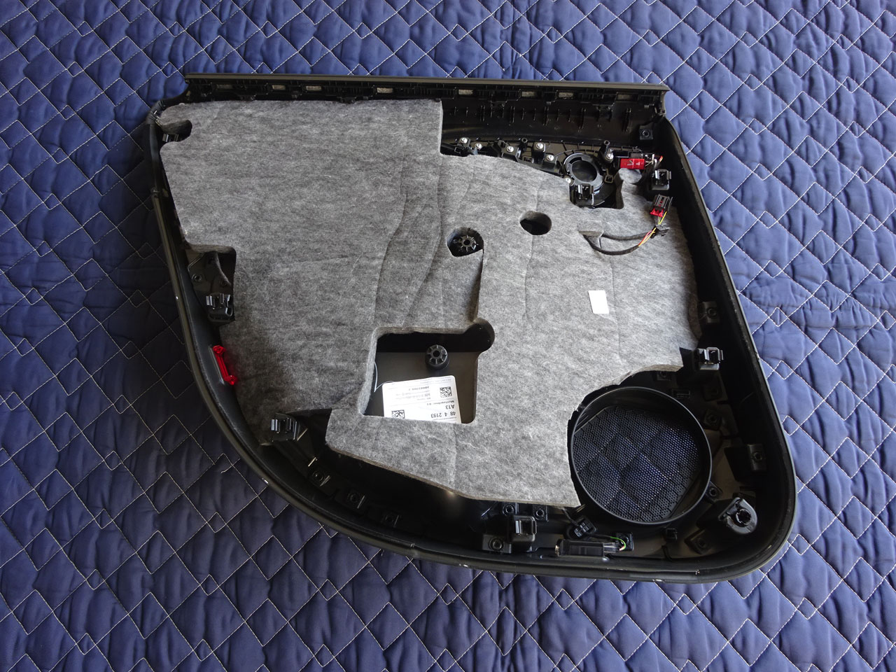 リアはスピーカー部分とボルトを締めるところをカットしなければいけませんでしたが、逆に言うとそれくらい、上出来です!こちらもきれいに覆ってくれました。フロント、リアとも品番ラベルのところが四角く開いているのも、純正ならではの配慮、形状が合わないわけではありません。このアイテムはまさに静音計画ですね(笑)