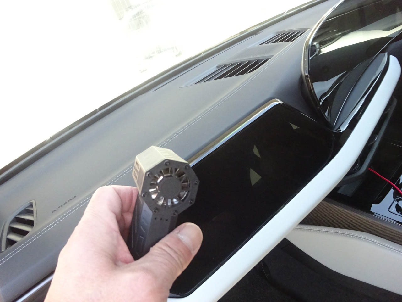 最近気に入っているアイテムがこちら、ハンドブロアーです。インテリアのホコリ取りは皆様おそらくマイクロファイバータオルや静電式マイクロブラシだと思いますが、ブロアだと一瞬でブワっとホコリが飛んでくれるのですごく便利、ご覧のとおり小さいのですが風量は十分、例えば写真のようにダッシュボードなんかは面積が広いですがドアを両方開けておけば数秒でホコリが外に出てなくなってくれるので超楽ちん、アウディだとセンターコンソールのシフト周りなんかも掃除するのが面倒、それが吹くだけでなくなってくれます。洗車にも使えますよね。いつまでも水が切れないドアシール周りやルーフレールやテールランプ、グリル周りの水切りには最高のアイテムと言えます。1台ドアポケットあたりに入れておいてください。このブロアーは充電式なので普段はコードレス、それも今や必須条件ですよね。ブロアの反対側にはLEDライトも装備、車内に落とし物した時も使えます。マルチなブロア、通販で8000円くらいで販売されているようです。