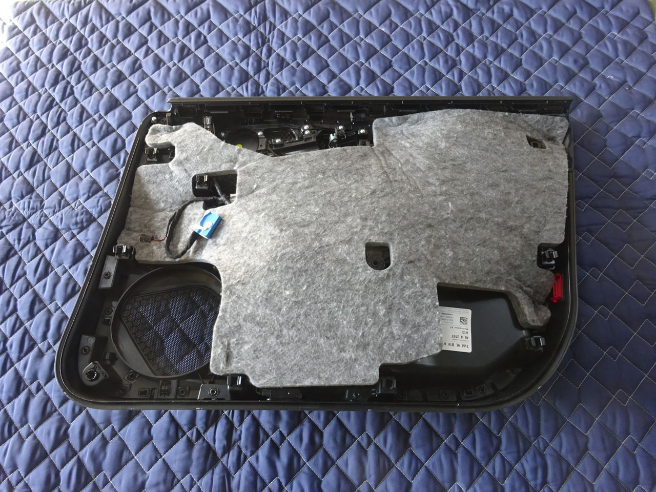 久々のA5(FU)ネタでございます。A5のドアトリムには先代もそうでしたがサウンドアブソーバーが省略されています。おそらくコストの問題かと思います。なぜならもう少し上のクラスにはしっかりとフロント、リアとも装備されています。いつも言いますがメーカーは絶対効果のないものは採用しませんからね!純正流用できるものを探したら、あったんですね~2段目の左写真、フロントとリアです。まずはフロント、心底驚きました何せ加工も何もせずともピッタリ、ドアコントロールユニットにつながるハーネス部分とそこにあるクリップ、その他のクリップやボルトを締める部分等、見事に避けているので何もせず(念のため取り付け時にずれないよう数か所両面テープで固定はしました)付けることができました。見た目も違いますよねハーネスやプラスチックやボルト等をきれいに隠してくれています。隠れた部分にもこだわるこれぞプレミアムブランド、なんて(笑)