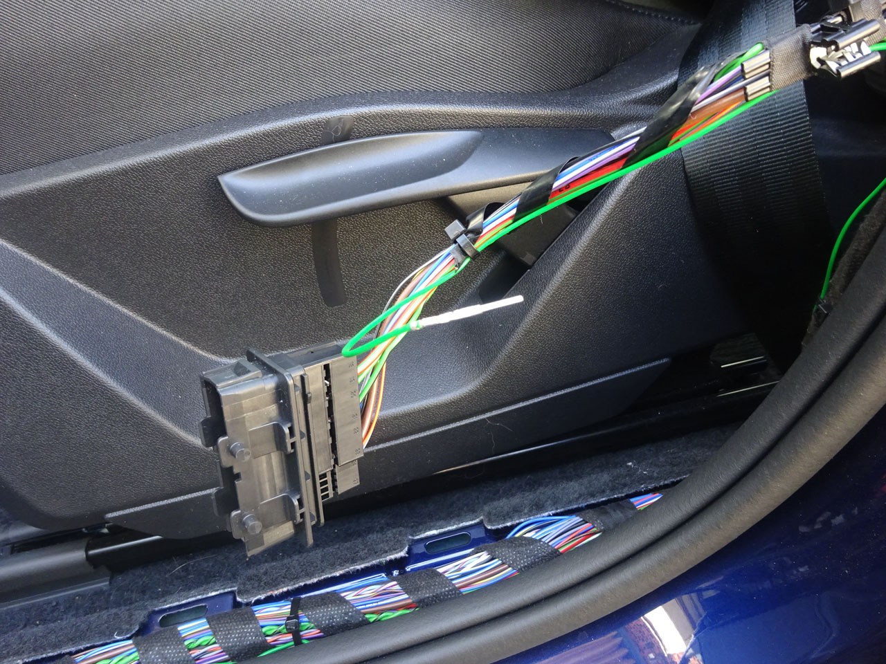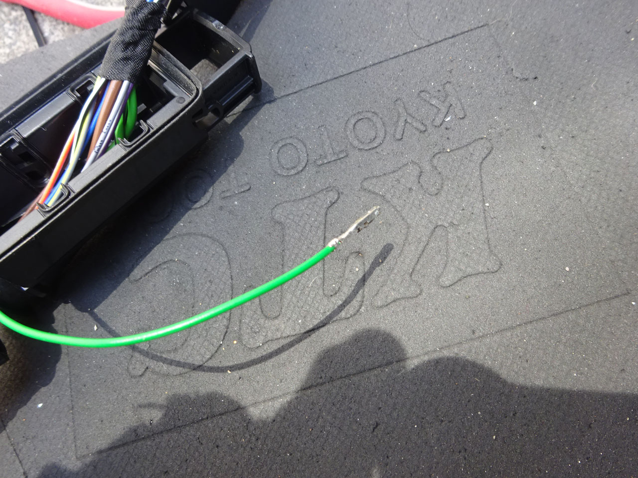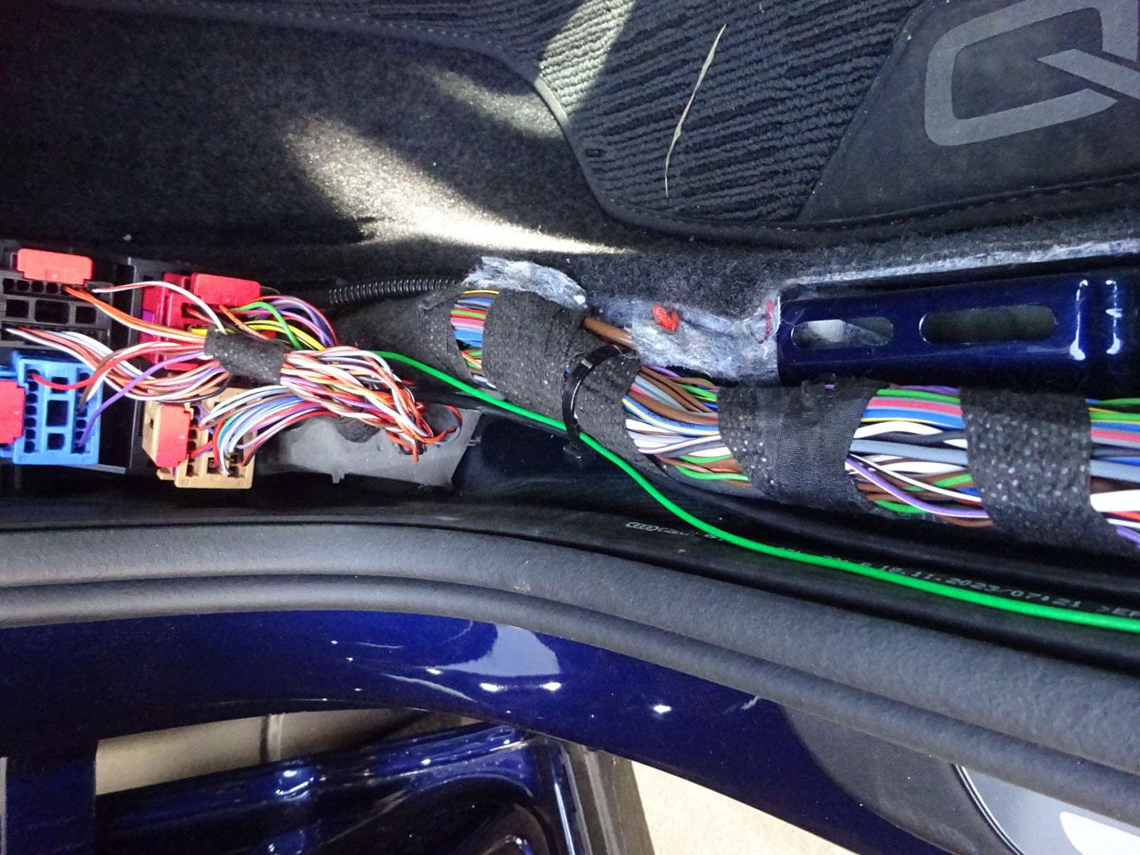 まずは運転席ダッシュカバー下側を外したところに鎮座しているアドバンスドキーの設定等を司るコントロールユニット、そこからピンを外します。Q2やA1SBの配線図を見ても、当然全車リアドアにはセンサーが入っていないので、どこから信号を取り出すかは記されていません。でも待てよ?と思ってリアドアにセンサーが入っている別の車の配線図から拾えばいいのではないか?と思ったのです。実験したら見事にビンゴ!ということで使用されていないピンにハーネスを左右2本を接続、ユニットに再度つなぎます。そこから丁寧に人からは決して見えないよう裏の裏をそれぞれリアドア前のBピラーまでハーネスを通します。外すトリムの多いこと(涙)