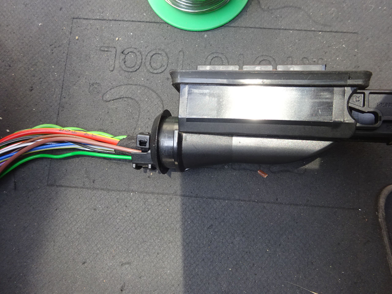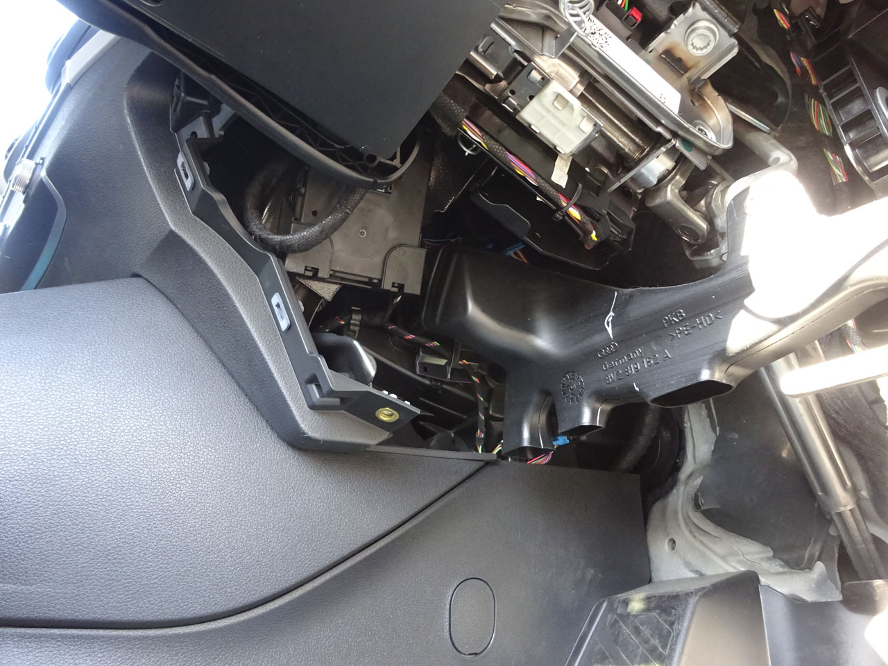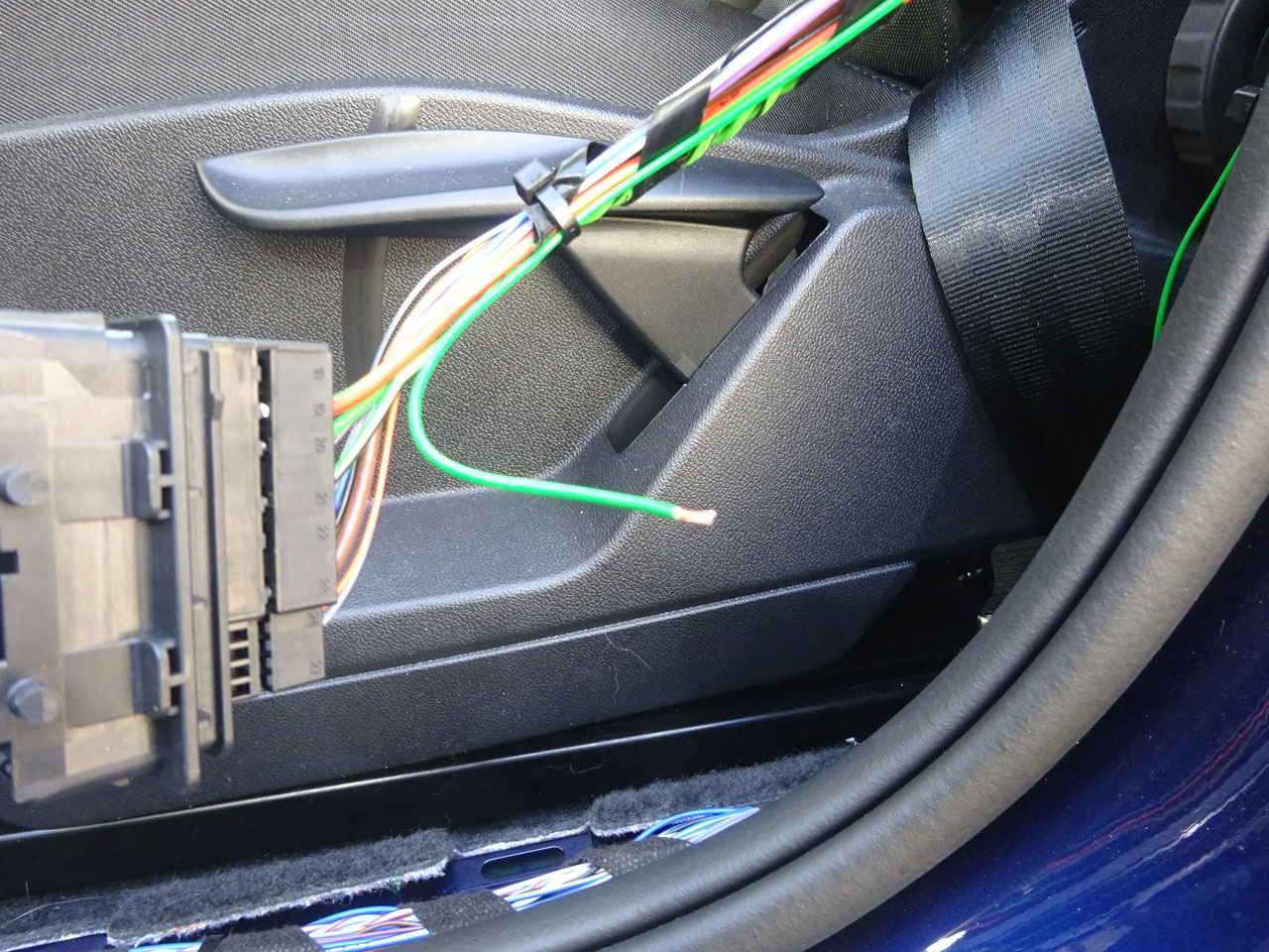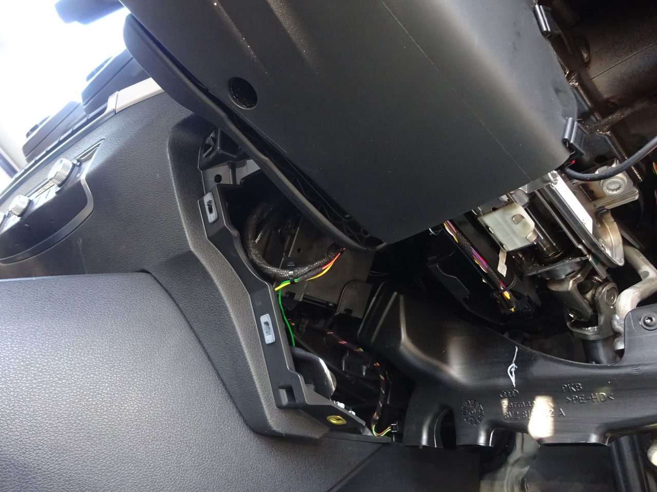 まずは運転席ダッシュカバー下側を外したところに鎮座しているアドバンスドキーの設定等を司るコントロールユニット、そこからピンを外します。Q2やA1SBの配線図を見ても、当然全車リアドアにはセンサーが入っていないので、どこから信号を取り出すかは記されていません。でも待てよ?と思ってリアドアにセンサーが入っている別の車の配線図から拾えばいいのではないか?と思ったのです。実験したら見事にビンゴ!ということで使用されていないピンにハーネスを左右2本を接続、ユニットに再度つなぎます。そこから丁寧に人からは決して見えないよう裏の裏をそれぞれリアドア前のBピラーまでハーネスを通します。外すトリムの多いこと(涙)