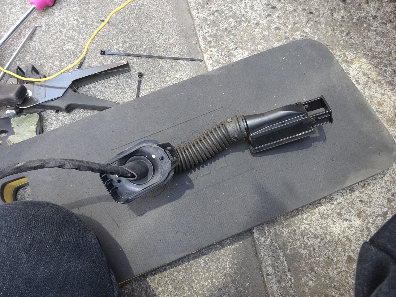 元々のハーネスと同じ経路をたどりようやくBピラーに到達、デカイドアのコネクターを外し、ハーネスにピンを圧着、コネクターにパチンします。オスのピンはこれで終了です。