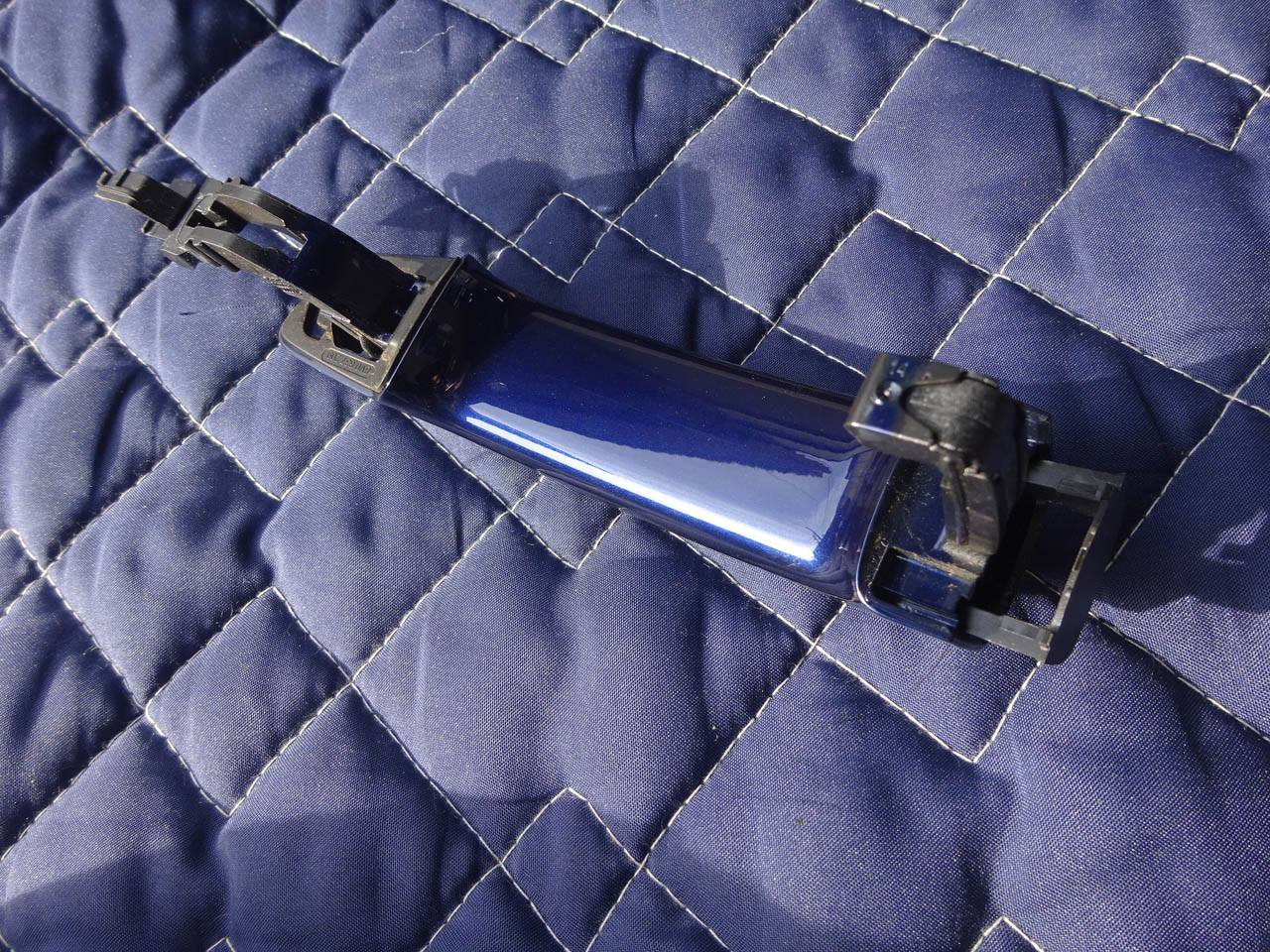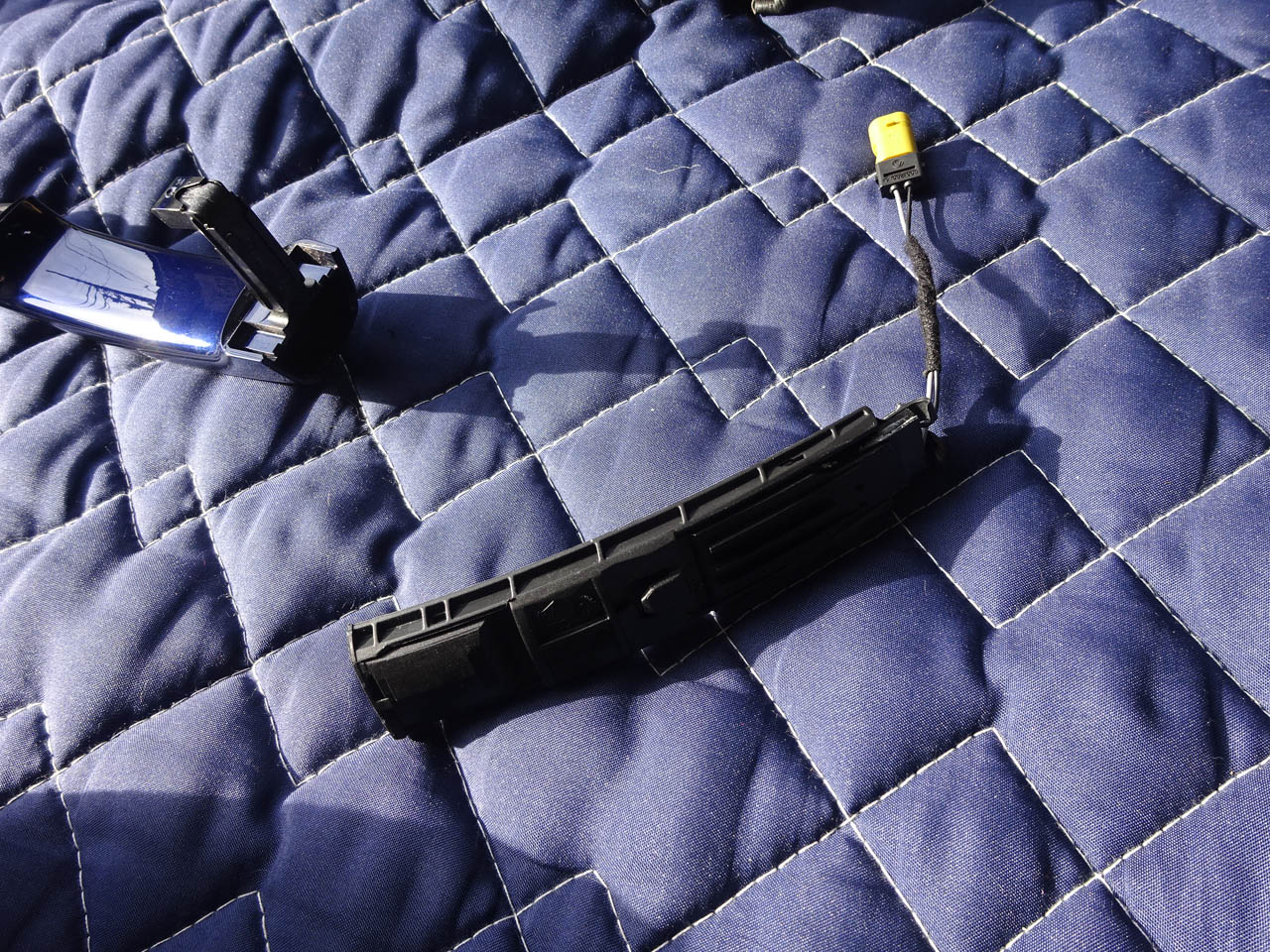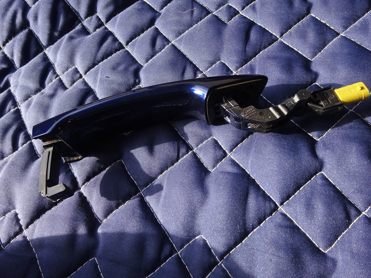 Q2のリアドアにG-Speed+Audi純正A1SB(GB)/Q2(GA)用リアドアコンタクトスイッチキットを取り付ける続きをどうぞ。作業はようやくドアハンドル本体に到達、横の小さい部分を横からレバーを差し込みロックを解除し、外します。するとドアハンドルを後方にスライドさせることが可能になり、あっさりパン!外れてくれます。センサーが入っていないのでコネクターもハーネスもつながっていません。