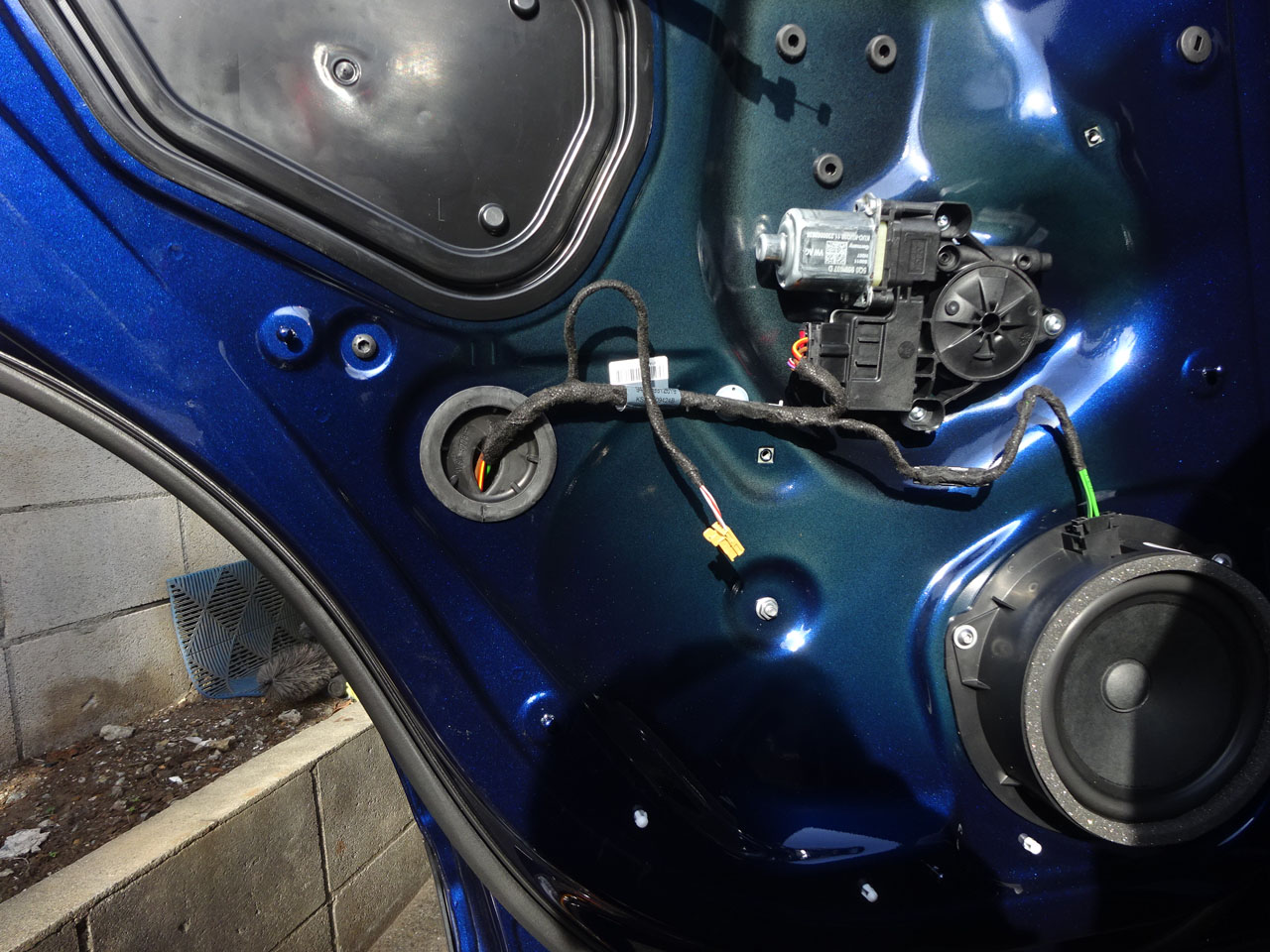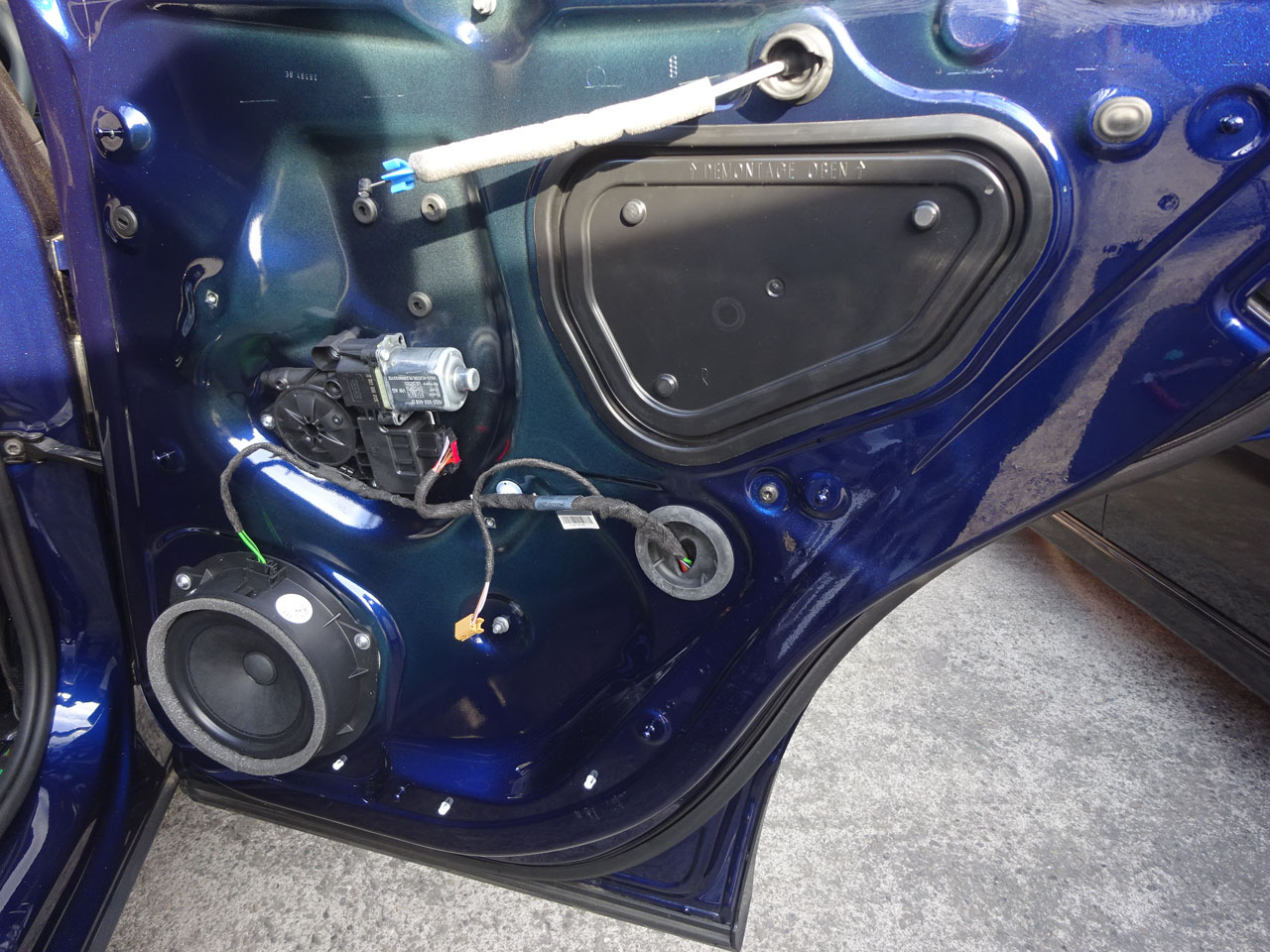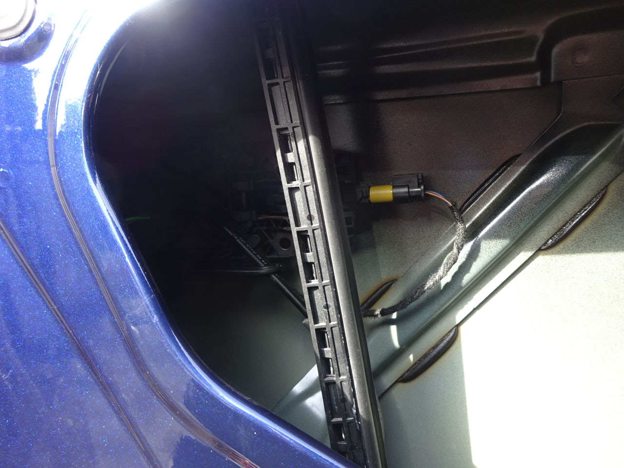 ドアの中からみるとこんな感じ、カラシ色のコネクターがタッチセンサーのコネクターになります。あれ簡単にドアガラスのレールがクリアできてるな~と思ったら、Q2って結構アウディでは珍しいリアドア後ろにいわゆる三角窓付き、だからレールがかなり前にあるんです。他のアウディは三角窓がないのでレールがギリギリ後ろ、外側にあるドアハンドルまでつながるハーネスはガラスレールを避ける必要があり、それが結構大変なのです。Q2好き!って最初なりました(笑)写っていませんがハーネスは慎重に緩く固定してバタつかないようにしておきました。完成です!三角窓のおかげで表面には全くハーネスは出ず、ノーマルと何ら変わらないスマート取り付けになりました!ドアトリムを戻します。Q2は結構ドアトリムを外すのが大変、ドアプルハンドルの表面がまあ外れてくれないのです!