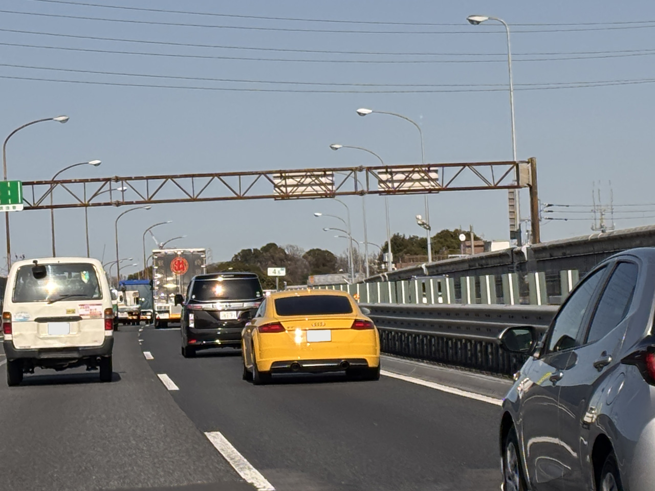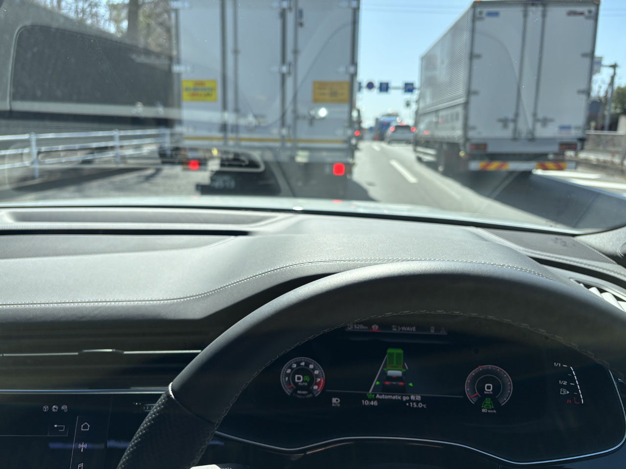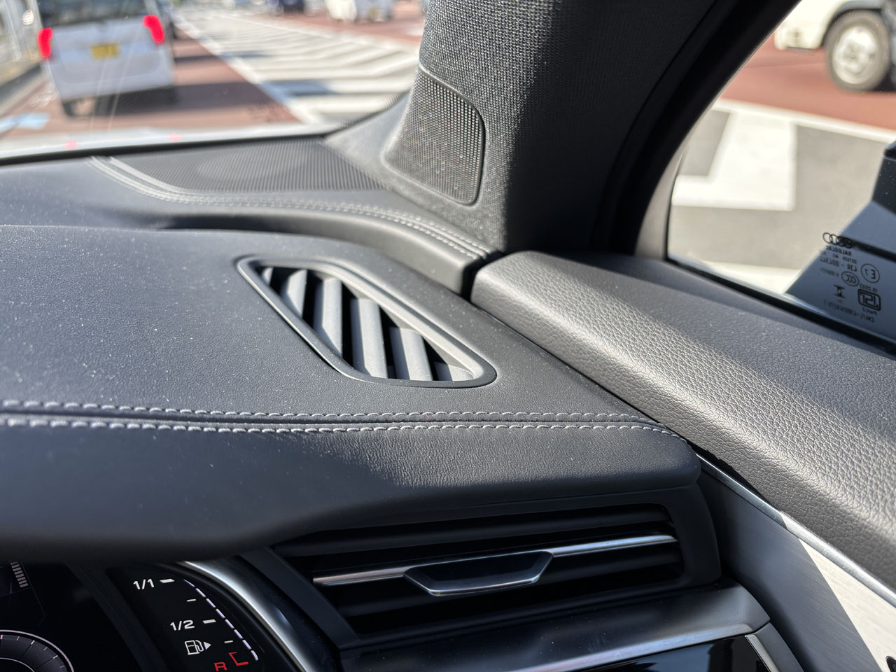 S Q7です。やはりいいですねアウディのV8エンジンは!ふんわりした音色といい、踏めば即反応する加速感といい、たまりません。本当にRS 6がV8ではなくV6になるのかと・・・心配です。で珍しいベガスイエローのTTクーペがビュンと追い越していきました(笑)TTは2027年にコンセプトCが名前を変えてBEVとして発売するということですが、BEVとは寂しい限りです。Q7のマルチファンクションカメラは広角タイプではないので自分の車線にいる前車は把握するようですが、別車線までは把握はしないようです。A5は対向車線までOKでした。それにしてもダッシュボードがここまできれいにレザーにステッチが入っているのに、ドアトリムで突如切れてしまうとは・・・確かパッケージの選び方によってドアトリムも入ると聞いた覚えがなきにしもあらず・・・