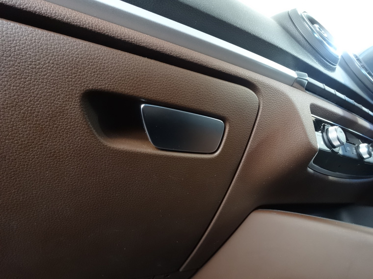 現行A3(8V)の非ライティングパッケージ仕様はグローブボックスのオペレーションレバーがただの樹脂で目立たず・・・でも大丈夫、アルミ調シルバーに交換が可能です。たかがグローブボックスされどグローブボックス、いつも目にする場所なので小さいパーツですが満足度が高いアイテムだと思います。
